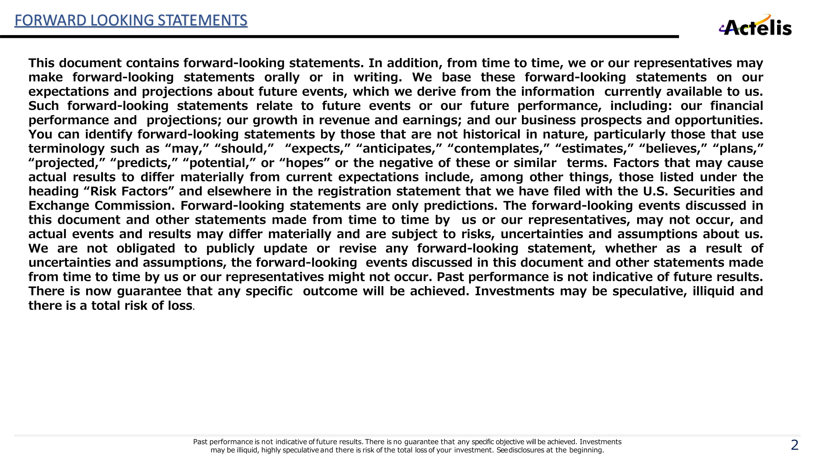 FORWARD LOOKING STATEMENTS This document contains forward - looking statements . In addition, from time to time, we or our representatives may make forward - looking statements orally or in writing . We base these forward - looking statements on our expectations and projections about future events, which we derive from the information currently available to us . Such forward - looking statements relate to future events or our future performance, including : our financial performance and projections ; our growth in revenue and earnings ; and our business prospects and opportunities . You can identify forward - looking statements by those that are not historical in nature, particularly those that use terminology such as “may,” “should,” “expects,” “anticipates,” “contemplates,” “estimates,” “believes,” “plans,” “projected,” “predicts,” “potential,” or “hopes” or the negative of these or similar terms . Factors that may cause actual results to differ materially from current expectations include, among other things, those listed under the heading “Risk Factors” and elsewhere in the registration statement that we have filed with the U . S . Securities and Exchange Commission . Forward - looking statements are only predictions . The forward - looking events discussed in this document and other statements made from time to time by us or our representatives, may not occur, and actual events and results may differ materially and are subject to risks, uncertainties and assumptions about us . We are not obligated to publicly update or revise any forward - looking statement, whether as a result of uncertainties and assumptions, the forward - looking events discussed in this document and other statements made from time to time by us or our representatives might not occur . Past performance is not indicative of future results . There is now guarantee that any specific outcome will be achieved . Investments may be speculative, illiquid and there is a total risk of loss . Past performance is not indicative of future results. There is no guarantee that any specific objective will be achieved. Investments may be illiquid, highly speculative and there is risk of the total loss of your investment. See disclosures at the beginning. 2