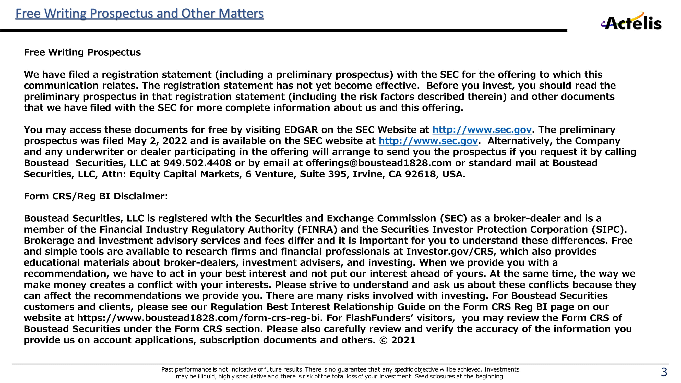 Free Writing Prospectus and Other Matters Free Writing Prospectus We have filed a registration statement (including a preliminary prospectus) with the SEC for the offering to which this communication relates. The registration statement has not yet become effective. Before you invest, you should read the preliminary prospectus in that registration statement (including the risk factors described therein) and other documents that we have filed with the SEC for more complete information about us and this offering. You may access these documents for free by visiting EDGAR on the SEC Website at http://www.sec.gov . The preliminary prospectus was filed May 2 , 2022 and is available on the SEC website at http://www.sec.gov . Alternatively, the Company and any underwriter or dealer participating in the offering will arrange to send you the prospectus if you request it by call ing Boustead Securities, LLC at 949.502.4408 or by email at offerings@boustead 1828 .com or standard mail at Boustead Securities, LLC, Attn: Equity Capital Markets, 6 Venture, Suite 395 , Irvine, CA 92618 , USA. Form CRS/Reg BI Disclaimer: Boustead Securities, LLC is registered with the Securities and Exchange Commission (SEC) as a broker - dealer and is a member of the Financial Industry Regulatory Authority (FINRA) and the Securities Investor Protection Corporation (SIPC). Brokerage and investment advisory services and fees differ and it is important for you to understand these differences. Free and simple tools are available to research firms and financial professionals at Investor.gov/CRS, which also provides educational materials about broker - dealers, investment advisers, and investing. When we provide you with a recommendation, we have to act in your best interest and not put our interest ahead of yours. At the same time, the way we make money creates a conflict with your interests. Please strive to understand and ask us about these conflicts because they can affect the recommendations we provide you. There are many risks involved with investing. For Boustead Securities customers and clients, please see our Regulation Best Interest Relationship Guide on the Form CRS Reg BI page on our website at https://www.boustead 1828 .com/form - crs - reg - bi. For FlashFunders ’ visitors, you may review the Form CRS of Boustead Securities under the Form CRS section. Please also carefully review and verify the accuracy of the information you provide us on account applications, subscription documents and others. © 2021 Past performance is not indicative of future results. There is no guarantee that any specific objective will be achieved. Investments may be illiquid, highly speculative and there is risk of the total loss of your investment. See disclosures at the beginning. 3