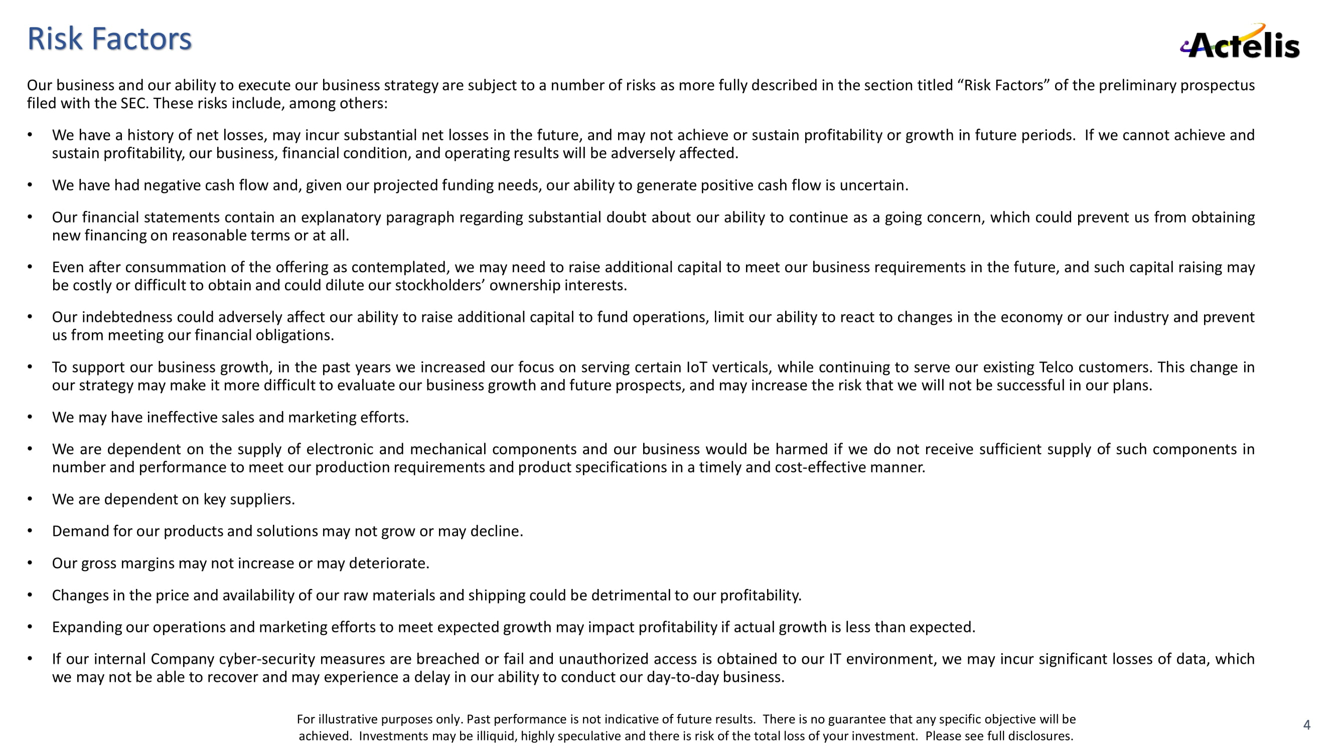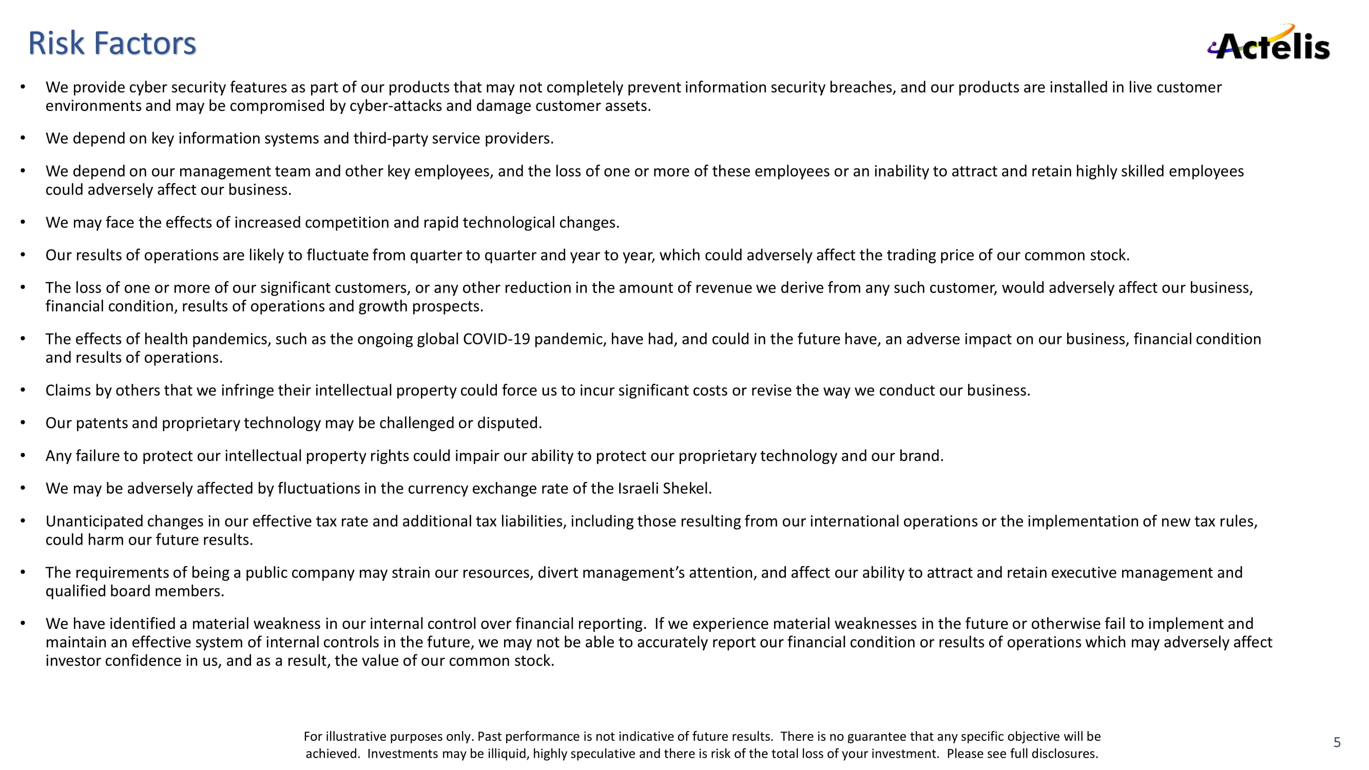 For illustrative purposes only. Past performance is not indicative of future results. There is no guarantee that any specifi c o bjective will be achieved. Investments may be illiquid, highly speculative and there is risk of the total loss of your investment. Please se e f ull disclosures. Risk Factors Our business and our ability to execute our business strategy are subject to a number of risks as more fully described in the se ction titled “Risk Factors” of the preliminary prospectus filed with the SEC. These risks include, among others: • We have a history of net losses, may incur substantial net losses in the future, and may not achieve or sustain profitability or growth in future periods . If we cannot achieve and sustain profitability, our business, financial condition, and operating results will be adversely affected . • We have had negative cash flow and, given our projected funding needs, our ability to generate positive cash flow is uncertain . • Our financial statements contain an explanatory paragraph regarding substantial doubt about our ability to continue as a going concern, which could prevent us from obtaining new financing on reasonable terms or at all . • Even after consummation of the offering as contemplated, we may need to raise additional capital to meet our business requirements in the future, and such capital raising may be costly or difficult to obtain and could dilute our stockholders’ ownership interests . • Our indebtedness could adversely affect our ability to raise additional capital to fund operations, limit our ability to react to changes in the economy or our industry and prevent us from meeting our financial obligations . • To support our business growth, in the past years we increased our focus on serving certain IoT verticals, while continuing to serve our existing Telco customers . This change in our strategy may make it more difficult to evaluate our business growth and future prospects, and may increase the risk that we will not be successful in our plans . • We may have ineffective sales and marketing efforts . • We are dependent on the supply of electronic and mechanical components and our business would be harmed if we do not receive sufficient supply of such components in number and performance to meet our production requirements and product specifications in a timely and cost - effective manner . • We are dependent on key suppliers . • Demand for our products and solutions may not grow or may decline . • Our gross margins may not increase or may deteriorate . • Changes in the price and availability of our raw materials and shipping could be detrimental to our profitability . • Expanding our operations and marketing efforts to meet expected growth may impact profitability if actual growth is less than expected . • If our internal Company cyber - security measures are breached or fail and unauthorized access is obtained to our IT environment, we may incur significant losses of data, which we may not be able to recover and may experience a delay in our ability to conduct our day - to - day business . 4