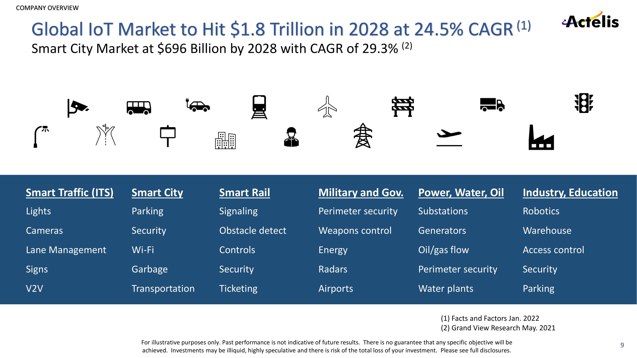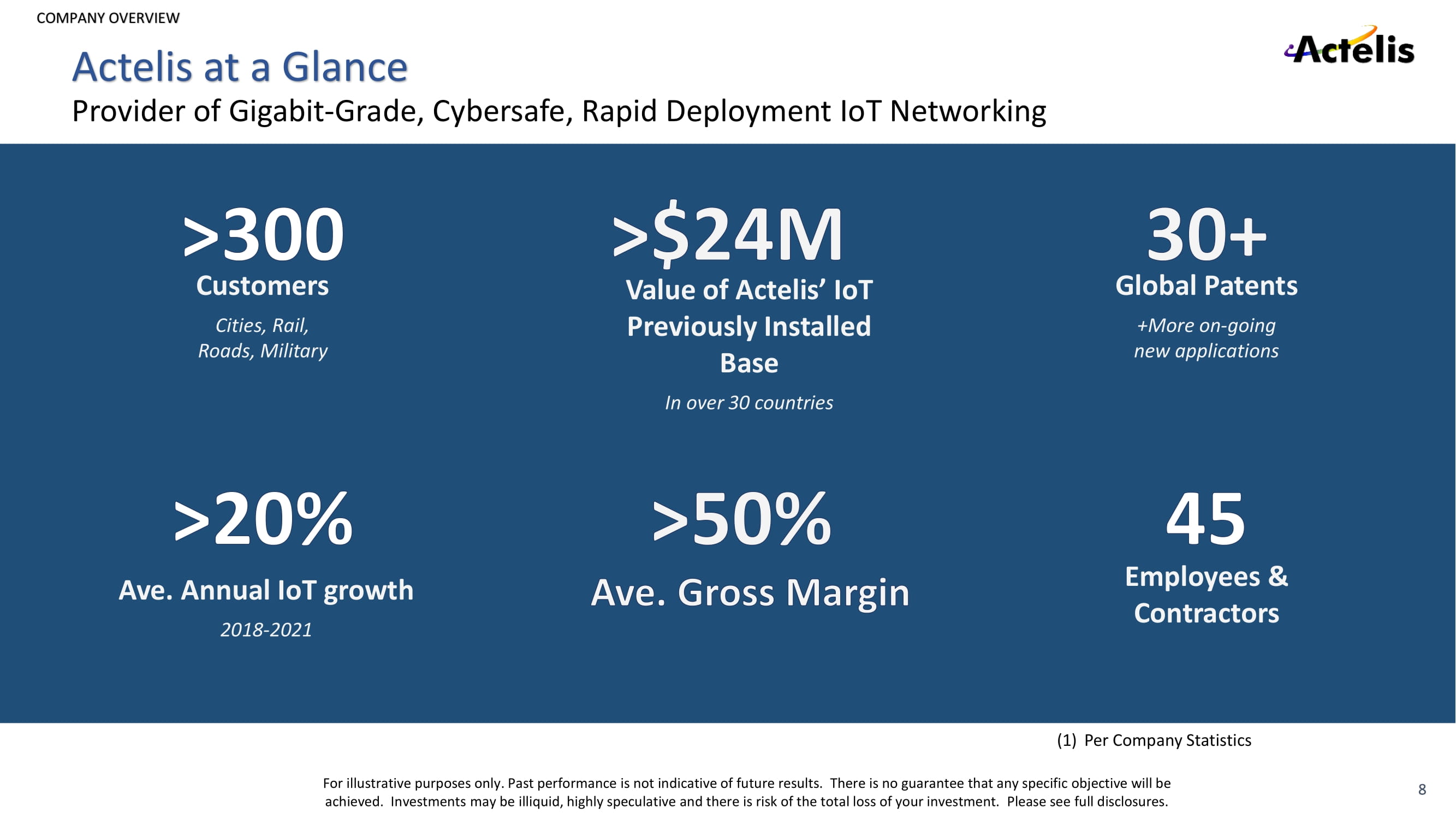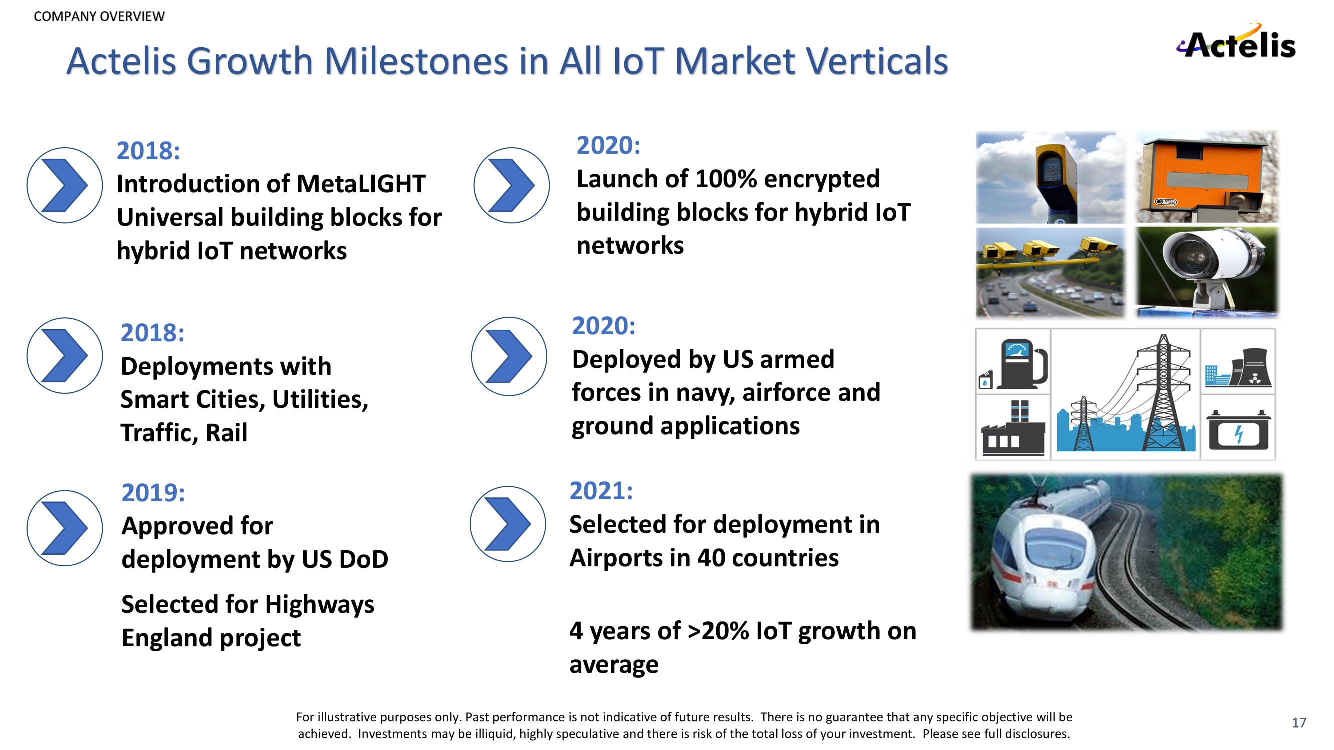 COMPANY OVERVIEW For illustrative purposes only. Past performance is not indicative of future results. There is no guarantee that any specifi c o bjective will be achieved. Investments may be illiquid, highly speculative and there is risk of the total loss of your investment. Please se e f ull disclosures. Customers Cities, Rail, Roads, Military Value of Actelis ’ IoT Previously Installed Base In over 30 countries Global Patents +More on - going new applications Ave. Annual IoT growth 2018 - 2021 Employees & Contractors 8 (1) Per Company Statistics Actelis at a Glance Provider of Gigabit - Grade, Cybersafe, Rapid Deployment IoT Networking