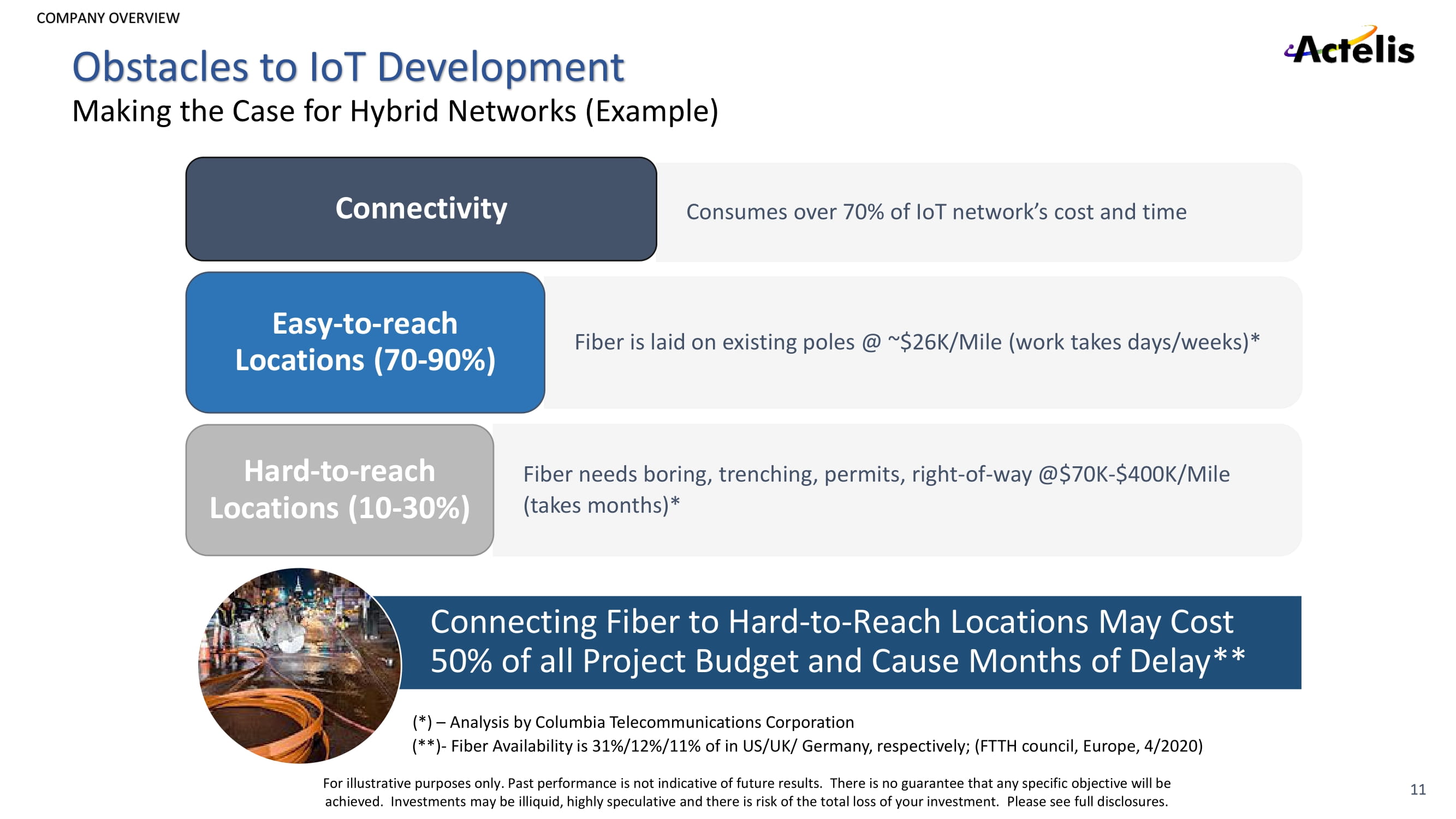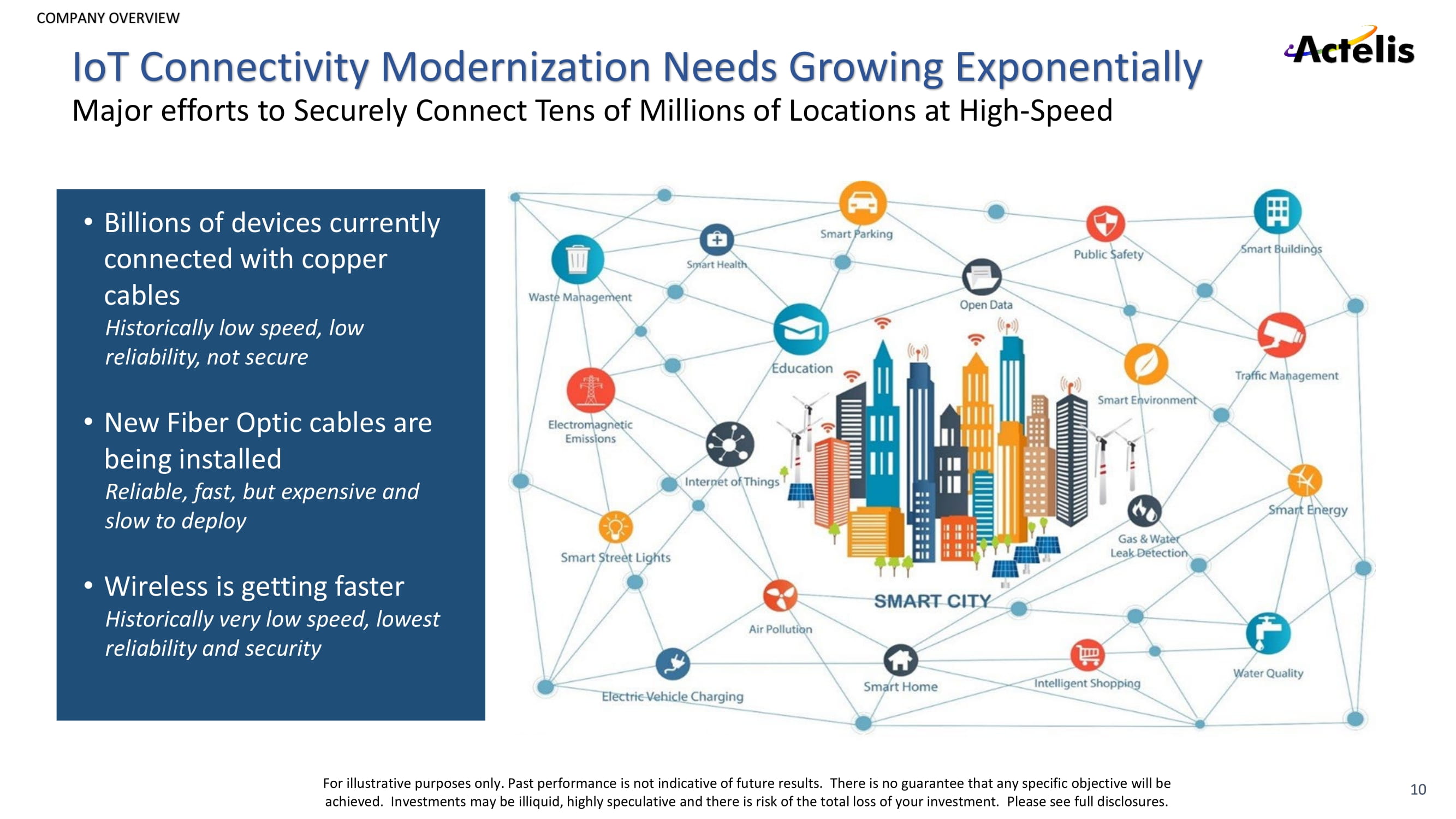 COMPANY OVERVIEW For illustrative purposes only. Past performance is not indicative of future results. There is no guarantee that any specifi c o bjective will be achieved. Investments may be illiquid, highly speculative and there is risk of the total loss of your investment. Please se e f ull disclosures. IoT Connectivity Modernization Needs Growing Exponentially • Billions of devices currently connected with copper cables Historically low speed, low reliability, not secure • New Fiber Optic cables are being installed Reliable, fast, but expensive and slow to deploy • Wireless is getting faster Historically very low speed, lowest reliability and security Major efforts to Securely Connect Tens of Millions of Locations at High - Speed 10