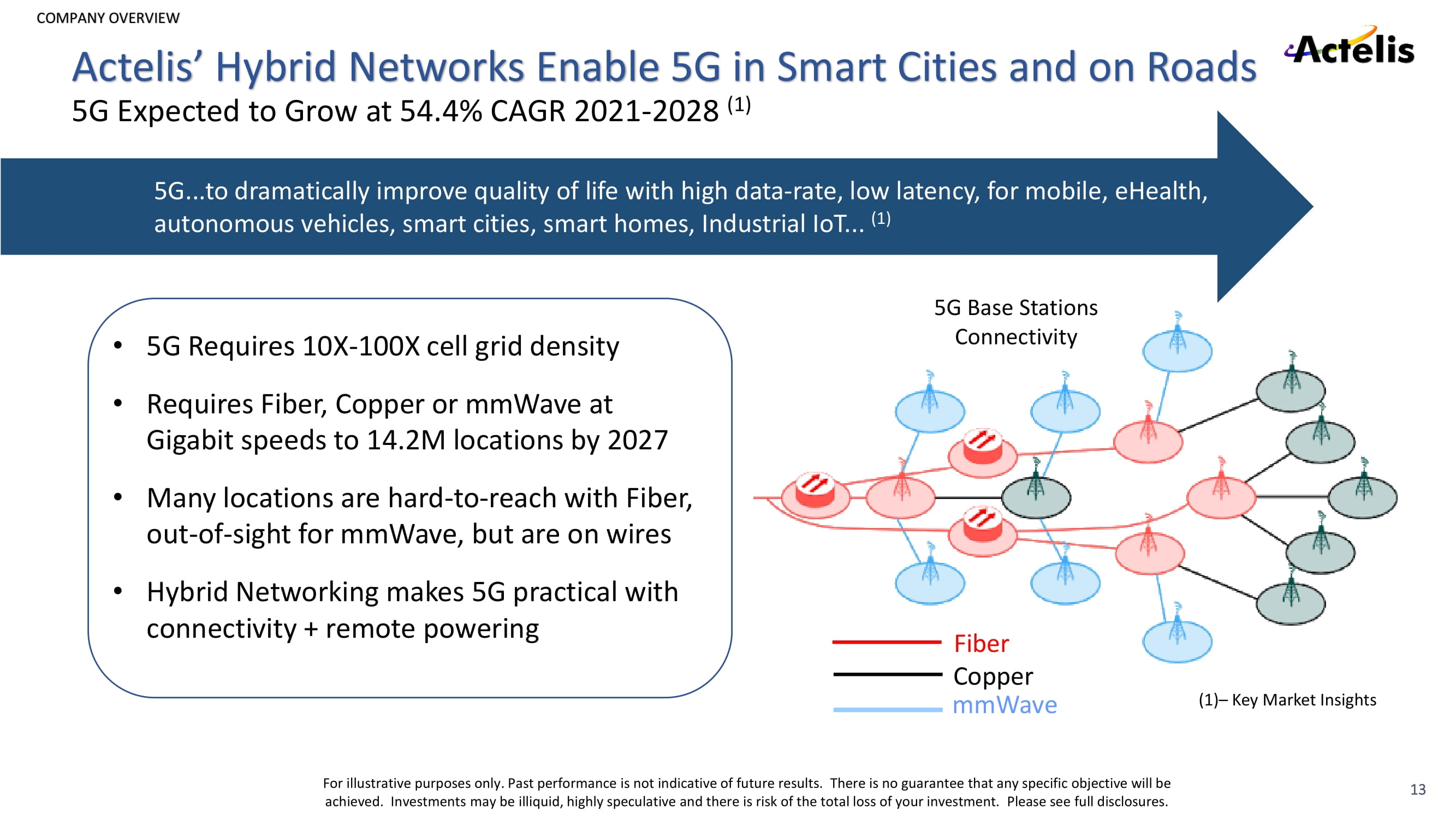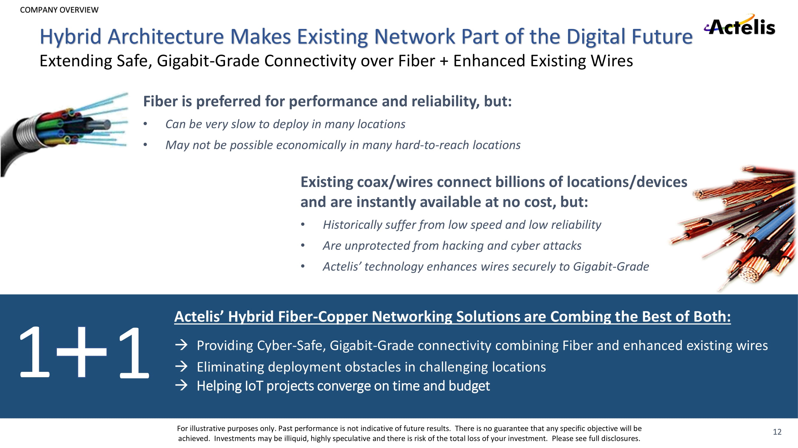 COMPANY OVERVIEW For illustrative purposes only. Past performance is not indicative of future results. There is no guarantee that any specifi c o bjective will be achieved. Investments may be illiquid, highly speculative and there is risk of the total loss of your investment. Please se e f ull disclosures. Fiber is preferred for performance and reliability, but: • Can be very slow to deploy in many locations • May not be possible economically in many hard - to - reach locations Actelis ’ Hybrid Fiber - Copper Networking Solutions are Combing the Best of Both: Providing Cyber - Safe, Gi g abit - Grade connectivity combining Fiber and enhanced existing wires Eliminating deployment obstacles in challenging locations Helping IoT projects converge on time and budget Existing coax/wires connect billions of locations/devices and are instantly available at no cost, but: • Historically suffer from low speed and low reliability • Are unprotected from hacking and cyber attacks • Actelis’ technology enhances wires securely to Gigabit - Grade 12 Extending Safe, Gigabit - Grade Connectivity over Fiber + Enhanced Existing Wires Hybrid Architecture Makes Existing Network Part of the Digital Future 1 1