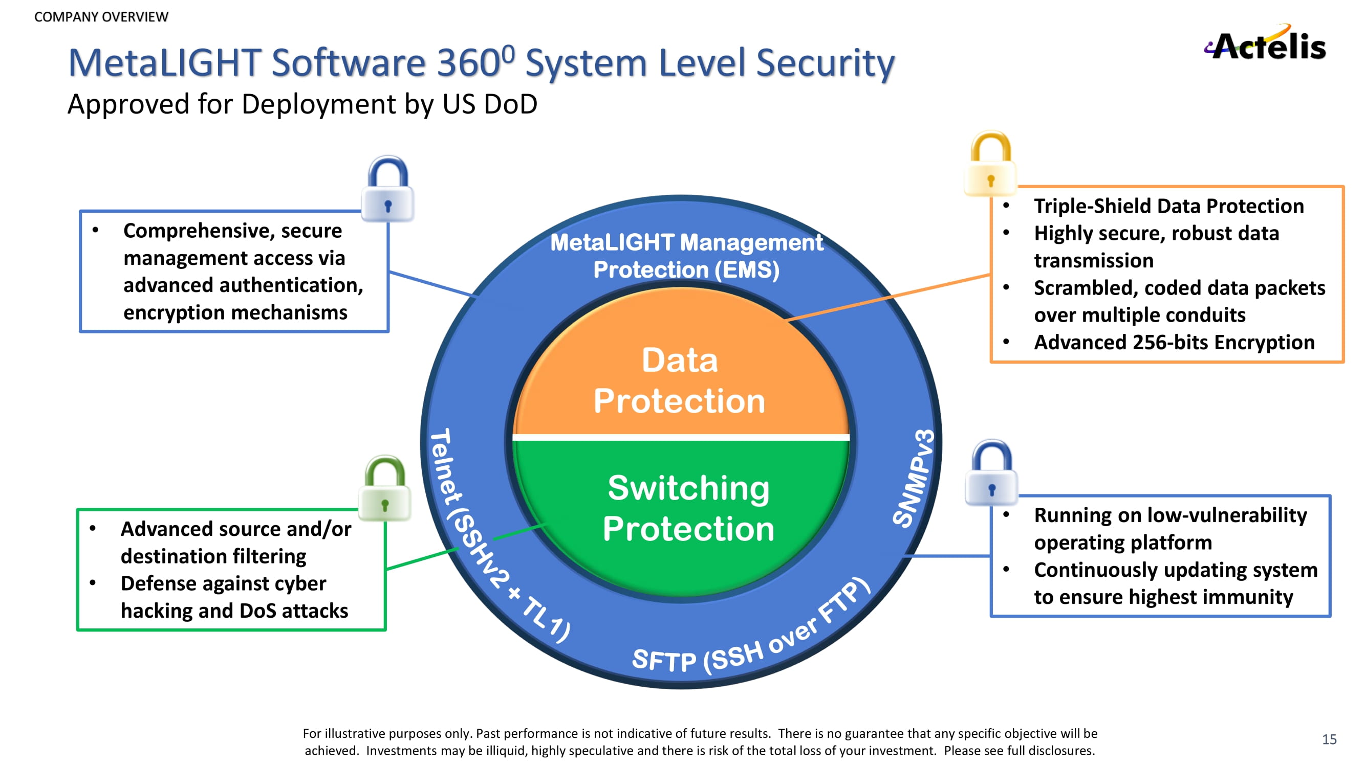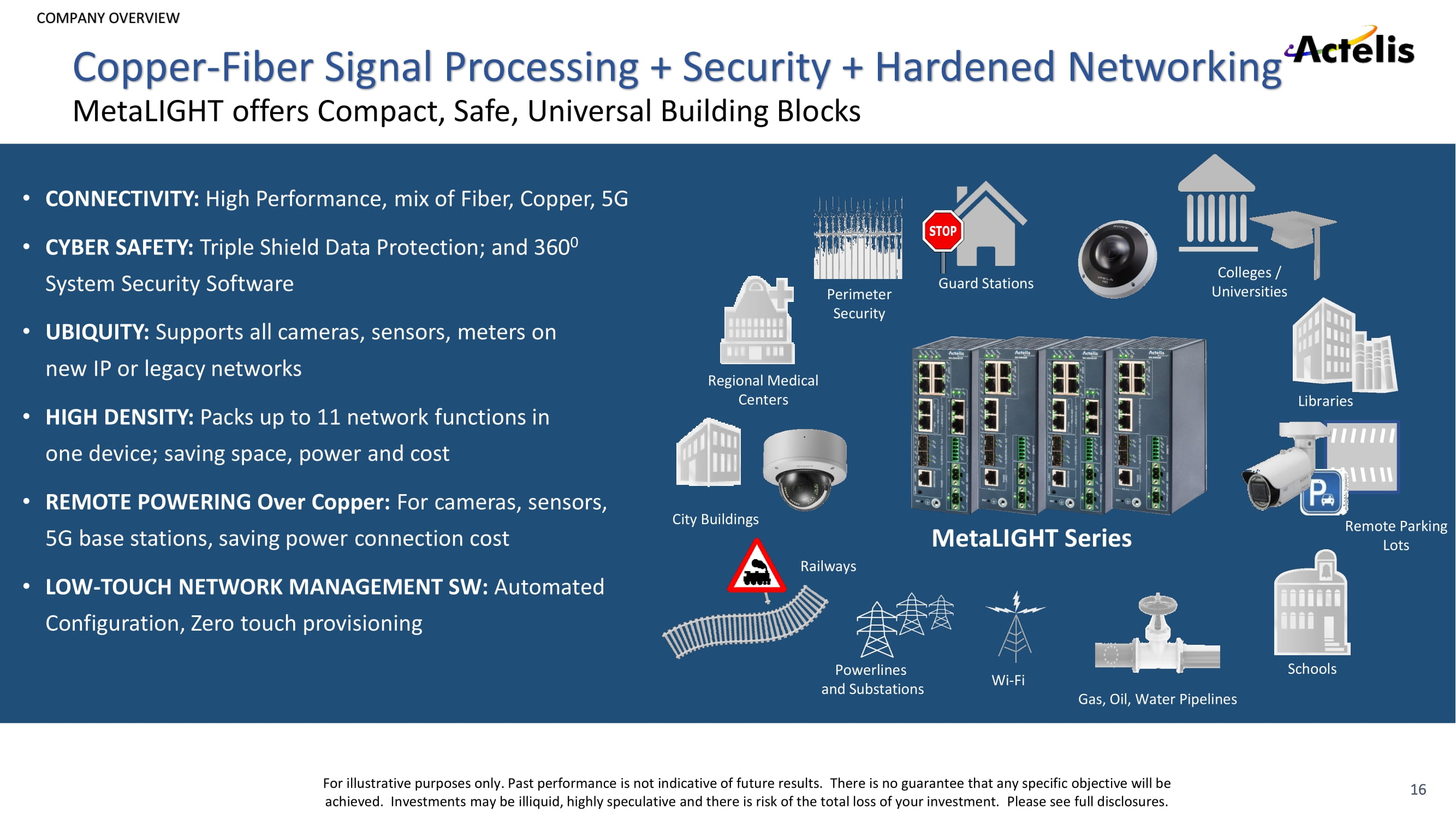 COMPANY OVERVIEW For illustrative purposes only. Past performance is not indicative of future results. There is no guarantee that any specifi c o bjective will be achieved. Investments may be illiquid, highly speculative and there is risk of the total loss of your investment. Please se e f ull disclosures. • CONNECTIVITY: High Performance, mix of Fiber, Copper, 5G • CYBER SAFETY: Triple Shield Data Protection; and 360 0 System Security Software • UBIQUITY: Supports all cameras, sensors, meters on new IP or legacy networks • HIGH DENSITY: Packs up to 11 network functions in one device; saving space, power and cost • REMOTE POWERING Over Copper: For cameras, sensors, 5G base stations, saving power connection cost • LOW - TOUCH NETWORK MANAGEMENT SW: Automated Configuration, Zero touch provisioning Libraries Schools City Buildings Regional Medical Centers Colleges / Universities Remote Parking Lots Guard Stations Perimeter Security Railways Powerlines and Substations Gas, Oil, Water Pipelines Wi - Fi MetaLIGHT Series 16 Copper - Fiber Signal Processing + Security + Hardened Networking MetaLIGHT offers Compact, Safe, Universal Building Blocks