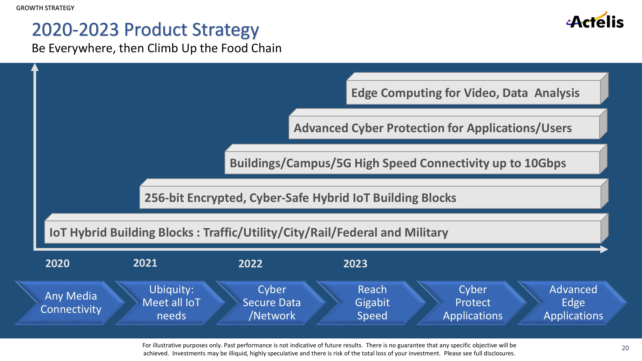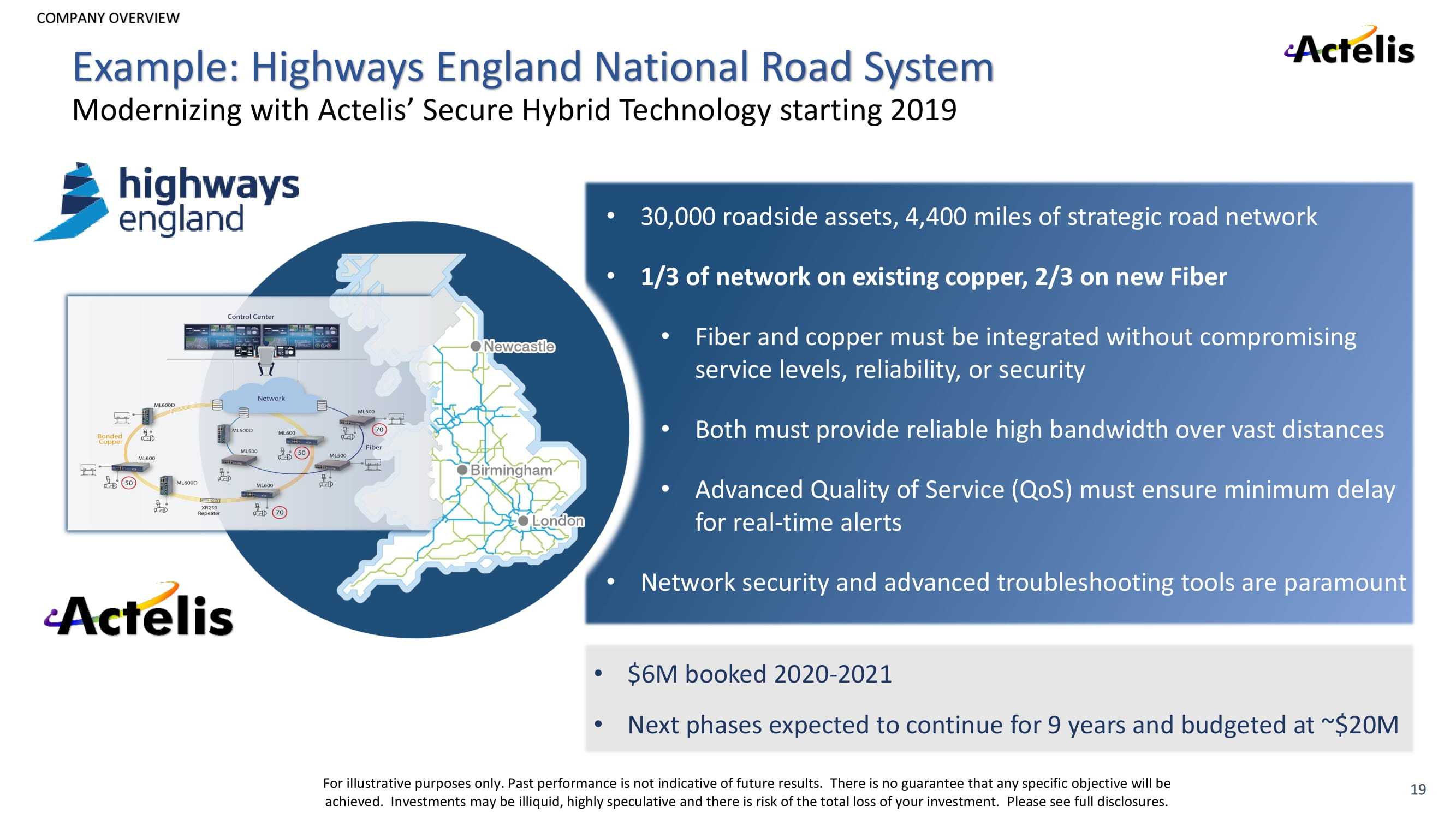 COMPANY OVERVIEW For illustrative purposes only. Past performance is not indicative of future results. There is no guarantee that any specifi c o bjective will be achieved. Investments may be illiquid, highly speculative and there is risk of the total loss of your investment. Please se e f ull disclosures. • 30,000 roadside assets, 4,400 miles of strategic road network • 1 / 3 of network on existing copper, 2 / 3 on new Fiber • Fiber and copper must be integrated without compromising service levels, reliability, or security • Both must provide reliable high bandwidth over vast distances • Advanced Quality of Service (QoS) must ensure minimum delay for real - time alerts • Network security and advanced troubleshooting tools are paramount • $ 6 M booked 2020 - 2021 • Next phases expected to continue for 9 years and budgeted at ~$ 20 M 19 Modernizing with Actelis’ Secure Hybrid Technology starting 2019 Example: Highways England National Road System
