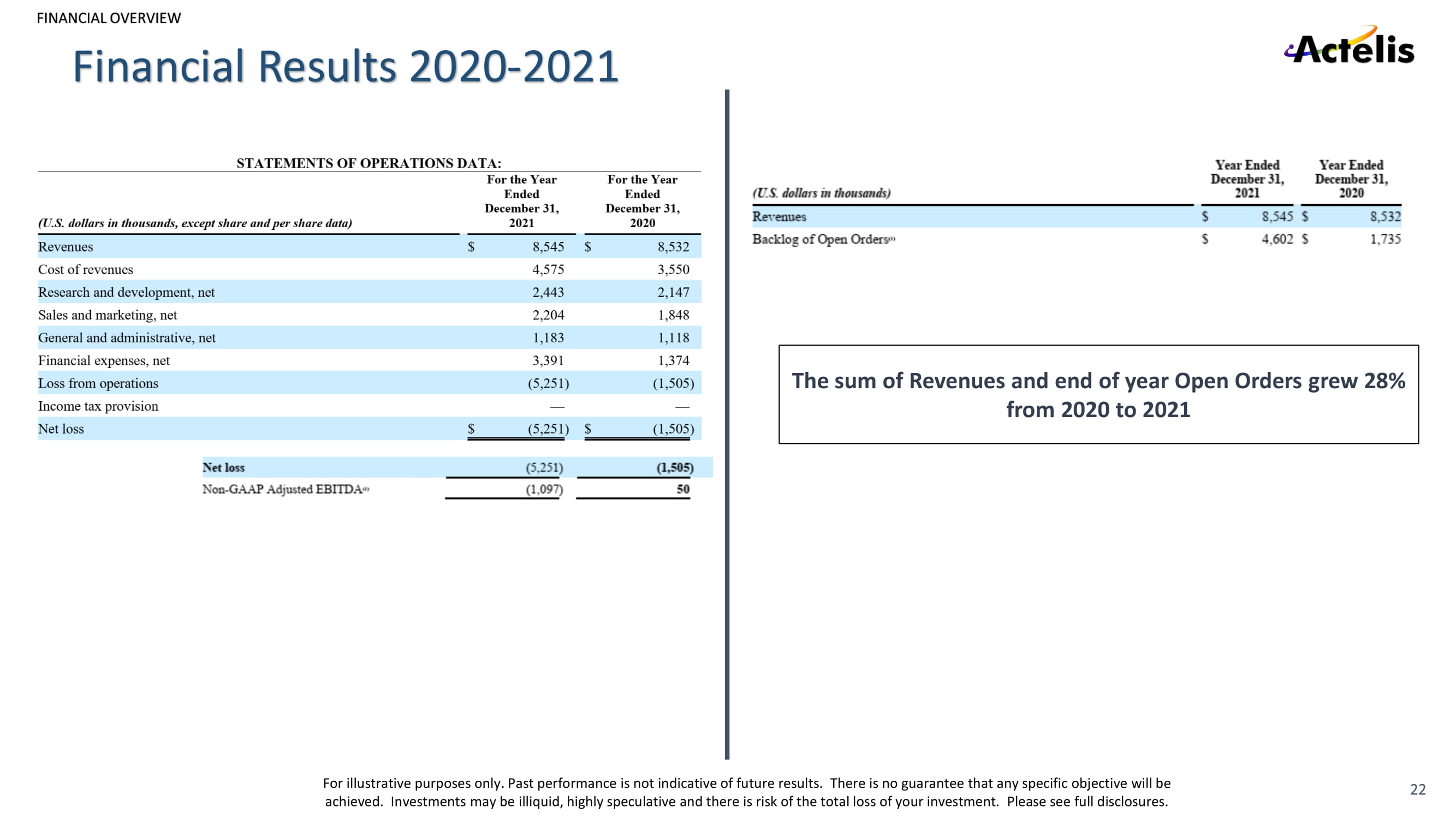 For illustrative purposes only. Past performance is not indicative of future results. There is no guarantee that any specifi c o bjective will be achieved. Investments may be illiquid, highly speculative and there is risk of the total loss of your investment. Please se e f ull disclosures. COMPETITIVE OVERVIEW 21 Leading Unique Real - Life Hybrid Offering Time/cost per bit Low High Low High Security Real Life Hybrid Networks Actelis ’ solutions offer significant competitive advantages in performance and security layers in both Fiber and copper. When combined into real - life hybrid copper - fiber networks, they offer higher security, faster deployment and lower cost. Competitive Landscape