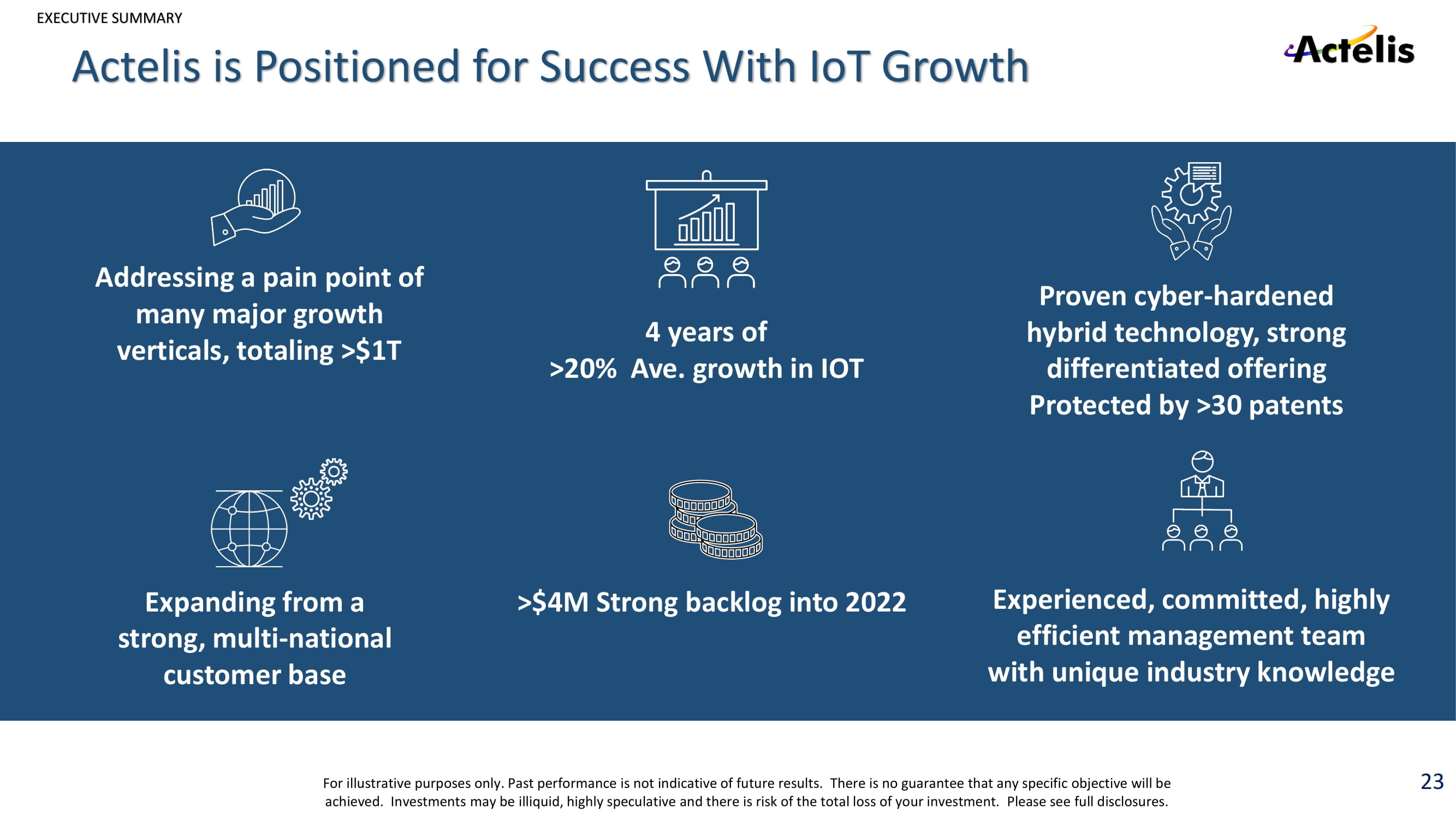For illustrative purposes only. Past performance is not indicative of future results. There is no guarantee that any specifi c o bjective will be achieved. Investments may be illiquid, highly speculative and there is risk of the total loss of your investment. Please se e f ull disclosures. EXECUTIVE SUMMARY Experienced, committed, highly efficient management team with unique industry knowledge Addressing a pain point of many major growth verticals, totaling >$ 1 T Proven cyber - hardened hybrid technology, strong differentiated offering Protected by > 30 patents 4 years of >20% Ave. growth in IOT Expanding from a strong, multi - national customer base Actelis is Positioned for Success With IoT Growth 23 >$4M Strong backlog into 2022