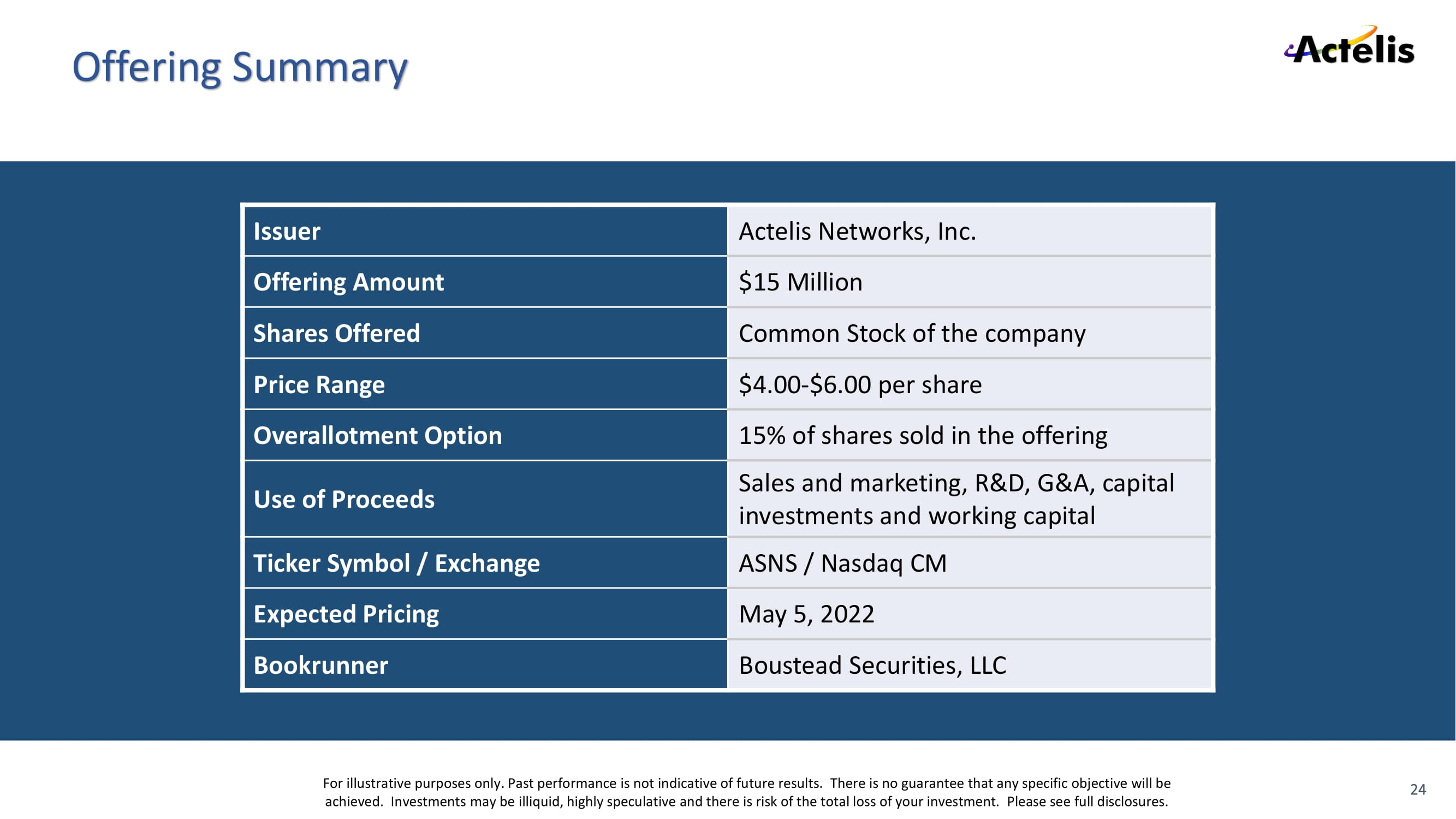 For illustrative purposes only. Past performance is not indicative of future results. There is no guarantee that any specifi c o bjective will be achieved. Investments may be illiquid, highly speculative and there is risk of the total loss of your investment. Please se e f ull disclosures. 24 Offering Summary Issuer Actelis Networks, Inc. Offering Amount $15 Million Shares Offered Common Stock of the company Price Range $4.00 - $6.00 per share Overallotment Option 15% of shares sold in the offering Use of Proceeds Sales and marketing, R&D, G&A, capital investments and working capital Ticker Symbol / Exchange ASNS / Nasdaq CM Expected Pricing May 5, 2022 Bookrunner Boustead Securities, LLC