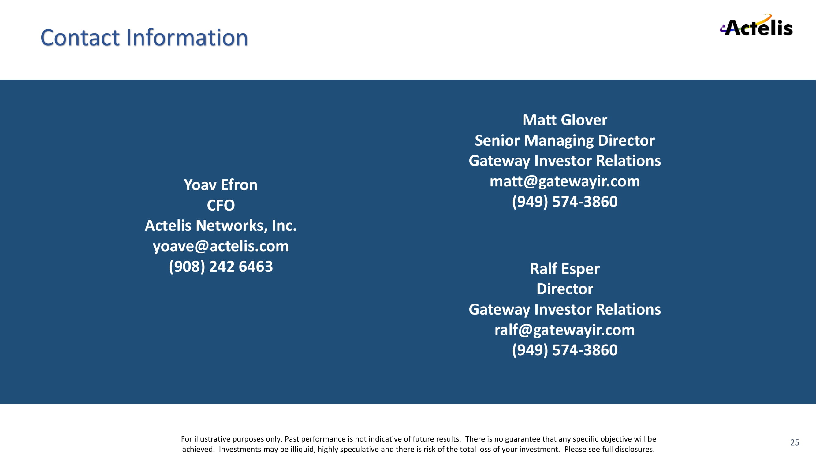 For illustrative purposes only. Past performance is not indicative of future results. There is no guarantee that any specifi c o bjective will be achieved. Investments may be illiquid, highly speculative and there is risk of the total loss of your investment. Please se e f ull disclosures. Matt Glover Senior Managing Director Gateway Investor Relations matt@gatewayir.com ( 949 ) 574 - 3860 Yoav Efron CFO Actelis Networks, Inc. yoave@actelis.com ( 908 ) 242 6463 Ralf Esper Director Gateway Investor Relations ralf@gatewayir.com ( 949 ) 574 - 3860 25 Contact Information