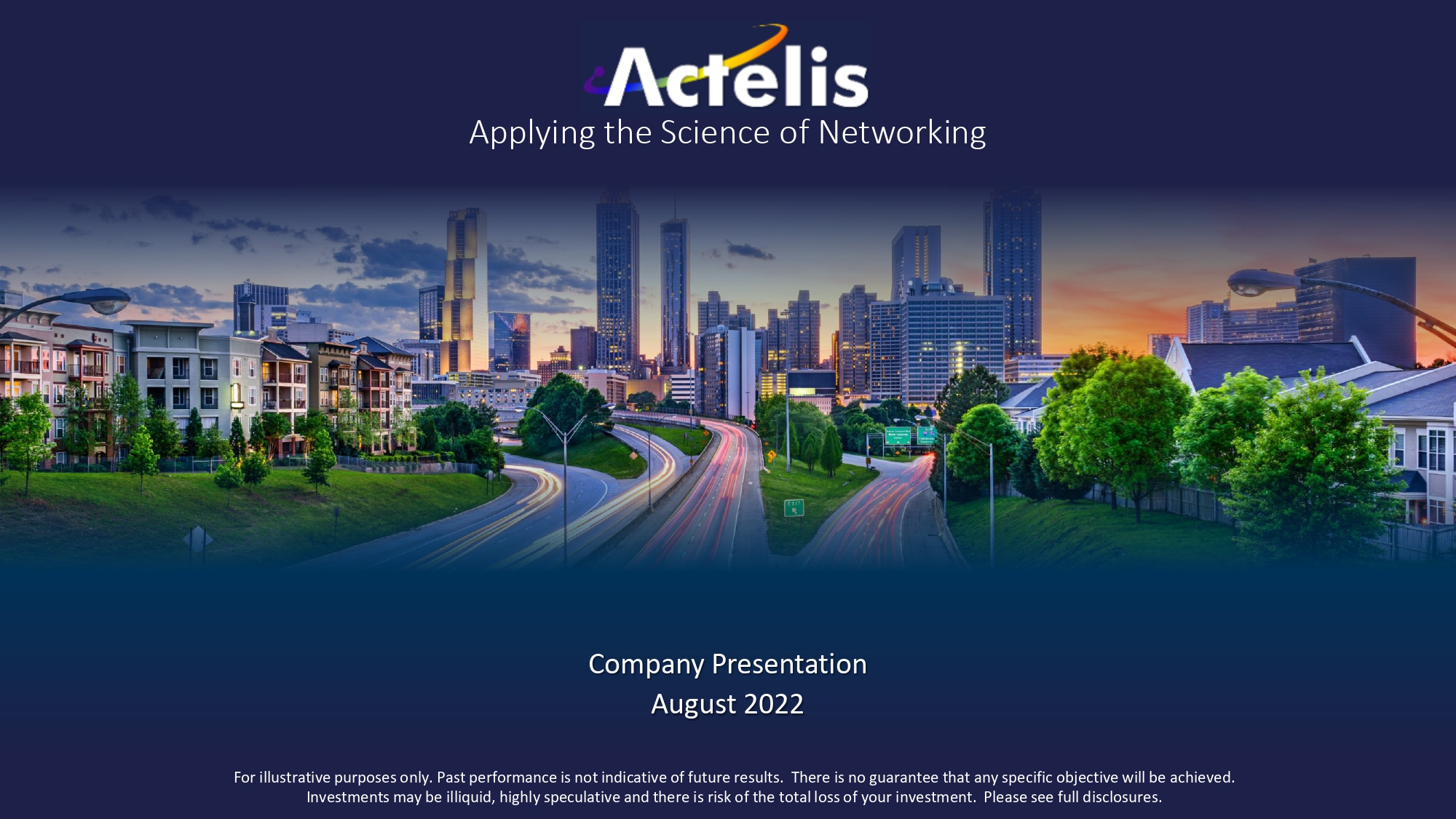 Company Presentation August 2022 Applying the Science of Networking For illustrative purposes only. Past performance is not indicative of future results. There is no guarantee that any specific objective will be achieved. Investments may be illiquid, highly speculative and there is risk of the total loss of your investment. Please see full disclosures.