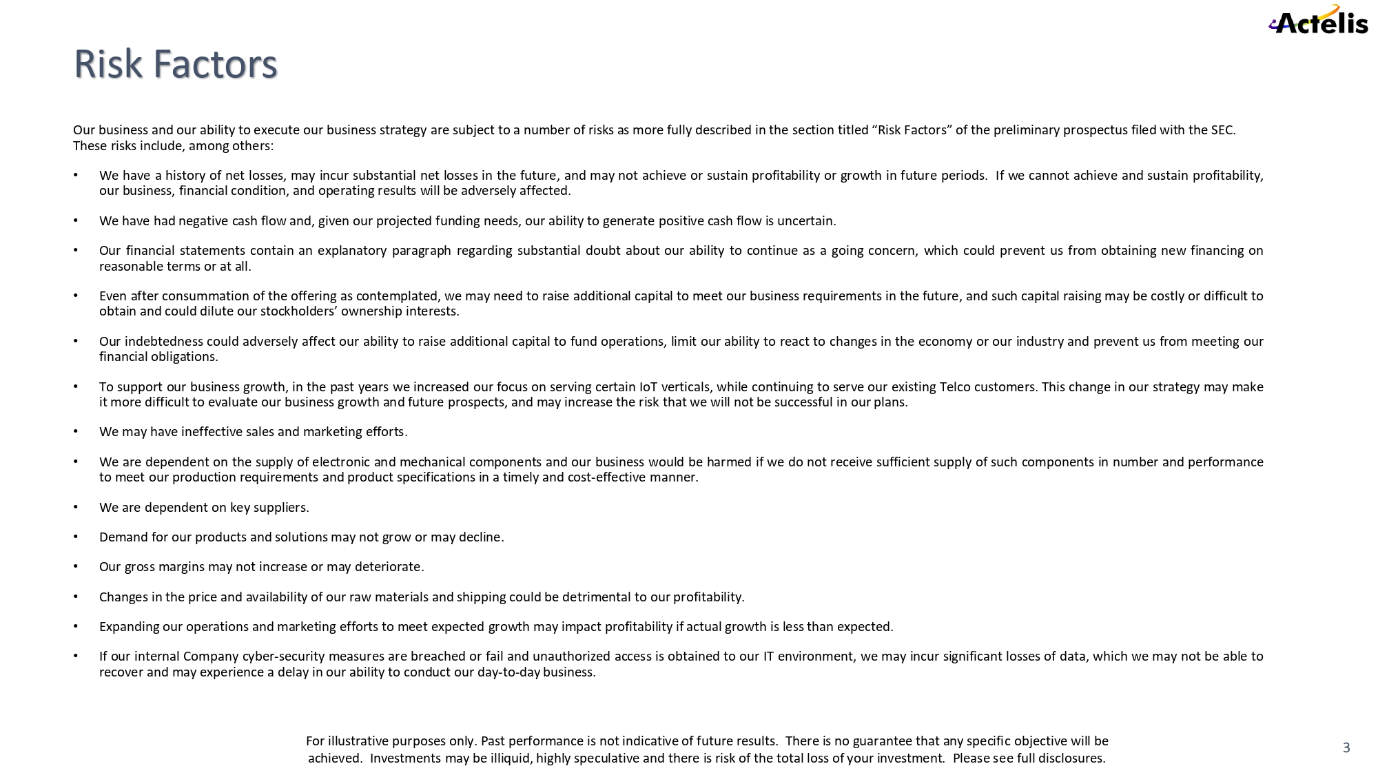 Disclaimer This Presentation is not an Offer or a Representation This Presentation does not constitute an offer, or a solicitation of an offer, to buy or sell any securities, investment or other specific product, or a solicitation of any vote or approval, nor shall there be any sale of securities, investment or other specific product in any jurisdiction in which such offer, solicitation or sale would be unlawful prior to registration or qualification under the securities laws of any such jurisdiction. The information contained herein does not purport to be all - inclusive and Actelis nor any of its subsidiaries, stockholders, affiliates, representatives, control persons, partners, members, managers, directors, officers, employees, advisers or agents make any representation or warranty, express or implied, as to the accuracy, completeness or reliability of the information contained in this Presentation. You should consult with your own counsel and tax and financial advisors as to legal and related matters concerning the matters described herein, and, by accepting this Presentation, you confirm that you are not relying solely upon the information contained herein to make any investment decision. The recipient shall not rely upon any statement, representation or warranty made by any other person, firm or corporation in making any investment decision. To the fullest extent permitted by law, in no circumstances will the Company or any of its subsidiaries, stockholders, affiliates, representatives, control persons, partners, members, managers, directors, officers, employees, advisers or agents be responsible or liable for any direct, indirect or consequential loss or loss of profit arising from the use of this Presentation, its contents, its omissions, reliance on the information contained within it, or on opinions communicated in relation thereto or otherwise arising in connection therewith. The general explanations included in this Presentation cannot address, and are not intended to address, your specific investment objectives, financial situations or financial needs. Nothing in this Presentation should be regarded as a representation by any person that the forward - looking statements set forth herein will be achieved or that any of the contemplated results of such forward - looking statements will be achieved. Financial Information and Use of Non - GAAP Financial Measures. The financial information contained in this Presentation has been taken from or prepared based on our historical financial statements for the periods presented. This presentation includes certain non - GAAP financial measures. These non - GAAP measures are an addition, and not a substitute for or superior to, measures of financial performance prepared in accordance with GAAP and should not be considered as an alternative to their nearest GAAP equivalent or any other performance measures derived in accordance with GAAP. We believe that these non - GAAP measures of financial results provide useful supplemental information to investors about Actelis. Our management uses forward - looking non - GAAP measures to evaluate our projected financials and operating performance. However, there are a number of limitations related to the use of these non - GAAP measures and their nearest GAAP equivalents. In addition, other companies may calculate non - GAAP measures differently, or may use other measures to calculate their financial performance, and therefore, our non - GAAP measures may not be directly comparable to similarly titled measures of other companies. Additionally, to the extent that forward - looking non - GAAP financial measures are provided, they are presented on a non - GAAP basis without reconciliations of such forward looking non - GAAP measures due to the inherent difficulty in forecasting and quantifying certain amounts that are necessary for such reconciliations. Past performance is not indicative of future results. There is no guarantee that any specific objective will be achieved. Investments may be illiquid, highly speculative and there is risk of the total loss of your investment. See disclosures at the beginning. 2