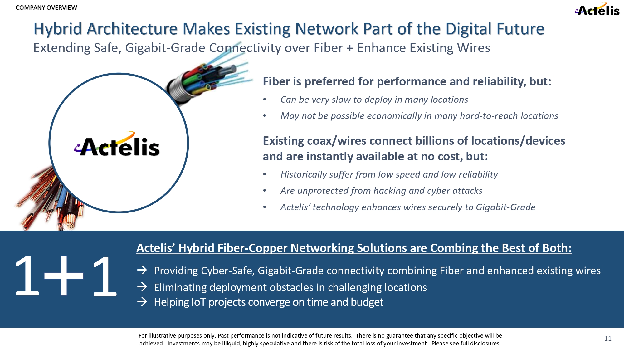 COMPANY OVERVIEW Easy - to - reach (70 - 90% of Locations) Hard - to - reach (10 - 30% of Locations) …Connecting Fiber to Hard - to - Reach Locations May Cost 50% of all Project Budget and may cause Months of Delay ** (*) – Analysis by Columbia Telecommunications Corporation (**) - Fiber Availability is 31%/12%/11% of in US/UK/ Germany, respectively; (FTTH council, Europe, 4/2020) • Fiber is laid on existing poles @ ~$26K/Mile • (work takes days/weeks)* Connectivity c onsumes over 70% of IoT network’s cost and time Easy to reach locations: Hard to reach locations: • Fiber needs boring, trenching, permits, right - of - way @$70K - $400K/Mile • (work takes months)* Obstacles to IoT Development – Hybrid Fiber/Copper is Key Making the Case for Hybrid Networks (Example) For illustrative purposes only. Past performance is not indicative of future results. There is no guarantee that any specific objective will be achieved. Investments may be illiquid, highly speculative and there is risk of the total loss of your investment. Please see full disclosures. 10