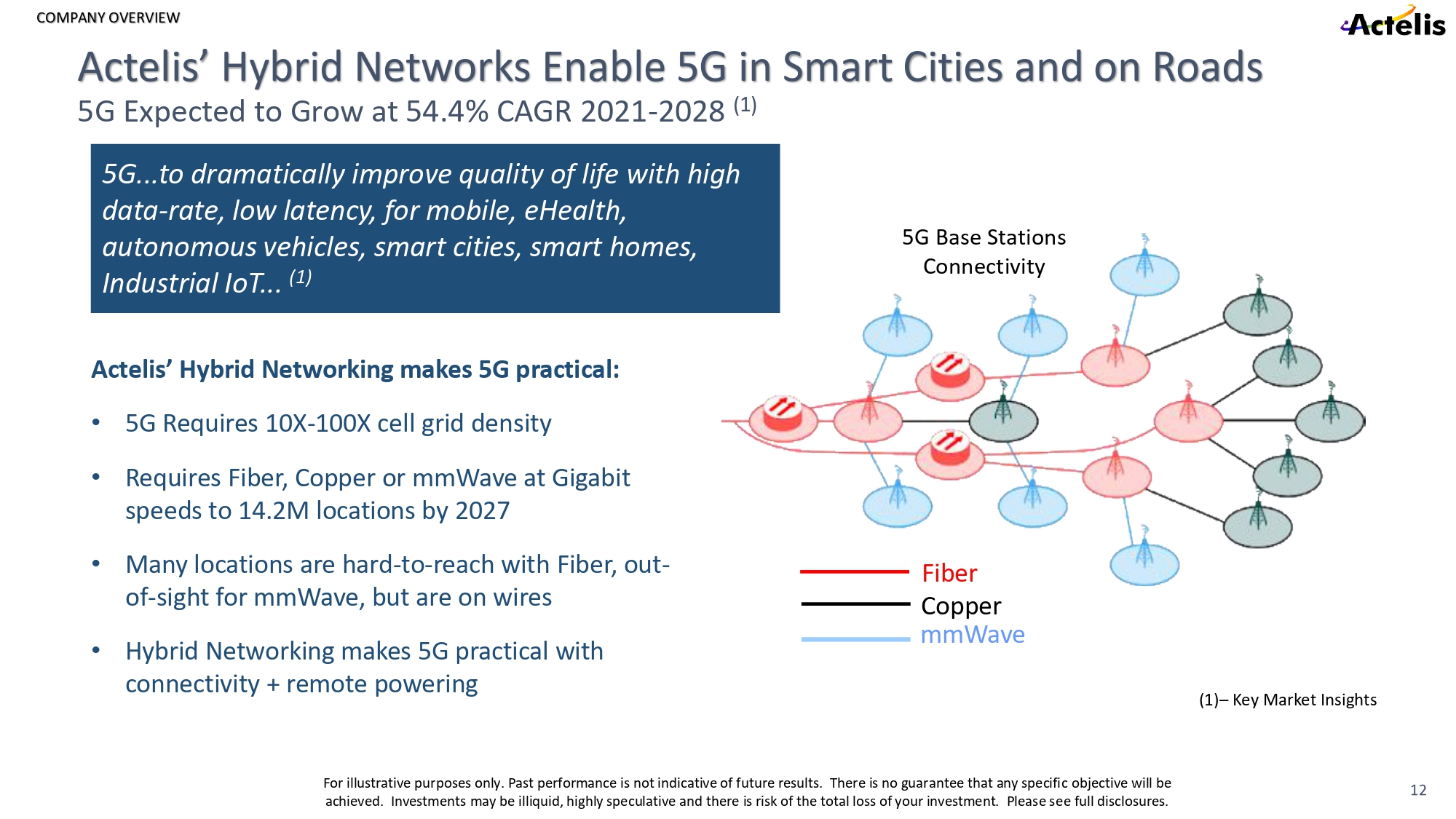 COMPANY OVERVIEW Hybrid Architecture Makes Existing Network Part of the Digital Future Extending Safe, Gigabit - Grade Connectivity over Fiber + Enhance Existing Wires Fiber is preferred for performance and reliability, but: • Can be very slow to deploy in many locations • May not be possible economically in many hard - to - reach locations Existing coax/wires connect billions of locations/devices and are instantly available at no cost, but: • Historically suffer from low speed and low reliability • Are unprotected from hacking and cyber attacks • Actelis’ technology enhances wires securely to Gigabit - Grade Actelis’ Hybrid Fiber - Copper Networking Solutions are Combing the Best of Both: Providing Cyber - Safe, Gigabit - Grade connectivity combining Fiber and enhanced existing wires Eliminating deployment obstacles in challenging locations Helping IoT projects converge on time and budget 1 For illustrative purposes only. Past performance is not indicative of future results. There is no guarantee that any specific objective will be achieved. Investments may be illiquid, highly speculative and there is risk of the total loss of your investment. Please see full disclosures. 11 1