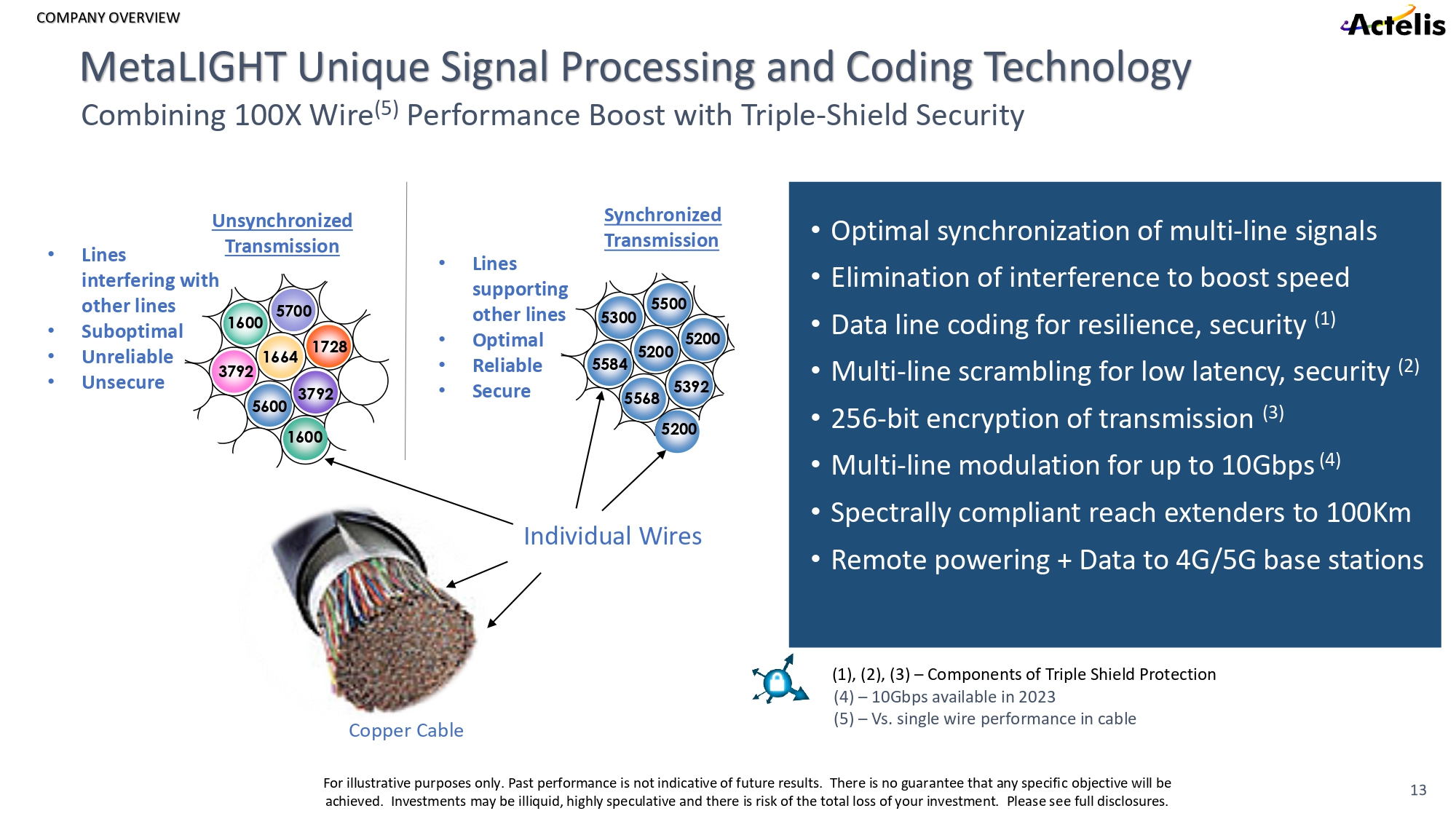 COMPANY OVERVIEW MetaLIGHT Unique Signal Processing and Coding Technology Combining 100X Wire (5) Performance Boost with Triple - Shield Security • Optimal synchronization of multi - line signals • Elimination of interference to boost speed • Data line coding for resilience, security (1) • Multi - line scrambling for low latency, security (2) • 256 - bit encryption of transmission (3) • Multi - line modulation for up to 10Gbps (4) • Spectrally compliant reach extenders to 100Km • Remote powering + Data to 4G/5G base stations 1728 1600 5600 5700 1664 3792 3792 1600 5568 5200 5300 5500 5584 5200 5392 5200 Unsynchronized Transmission • Lines supporting other lines • Optimal • Reliable • Secure Copper Cable • Lines interfering with other lines • Suboptimal • Unreliable • Unsecure Synchronized Transmission Individual Wires (1), (2), (3) – Components of Triple Shield Protection (4) – 10Gbps available in 2023 (5) – Vs. single wire performance in cable For illustrative purposes only. Past performance is not indicative of future results. There is no guarantee that any specific objective will be achieved. Investments may be illiquid, highly speculative and there is risk of the total loss of your investment. Please see full disclosures. 13