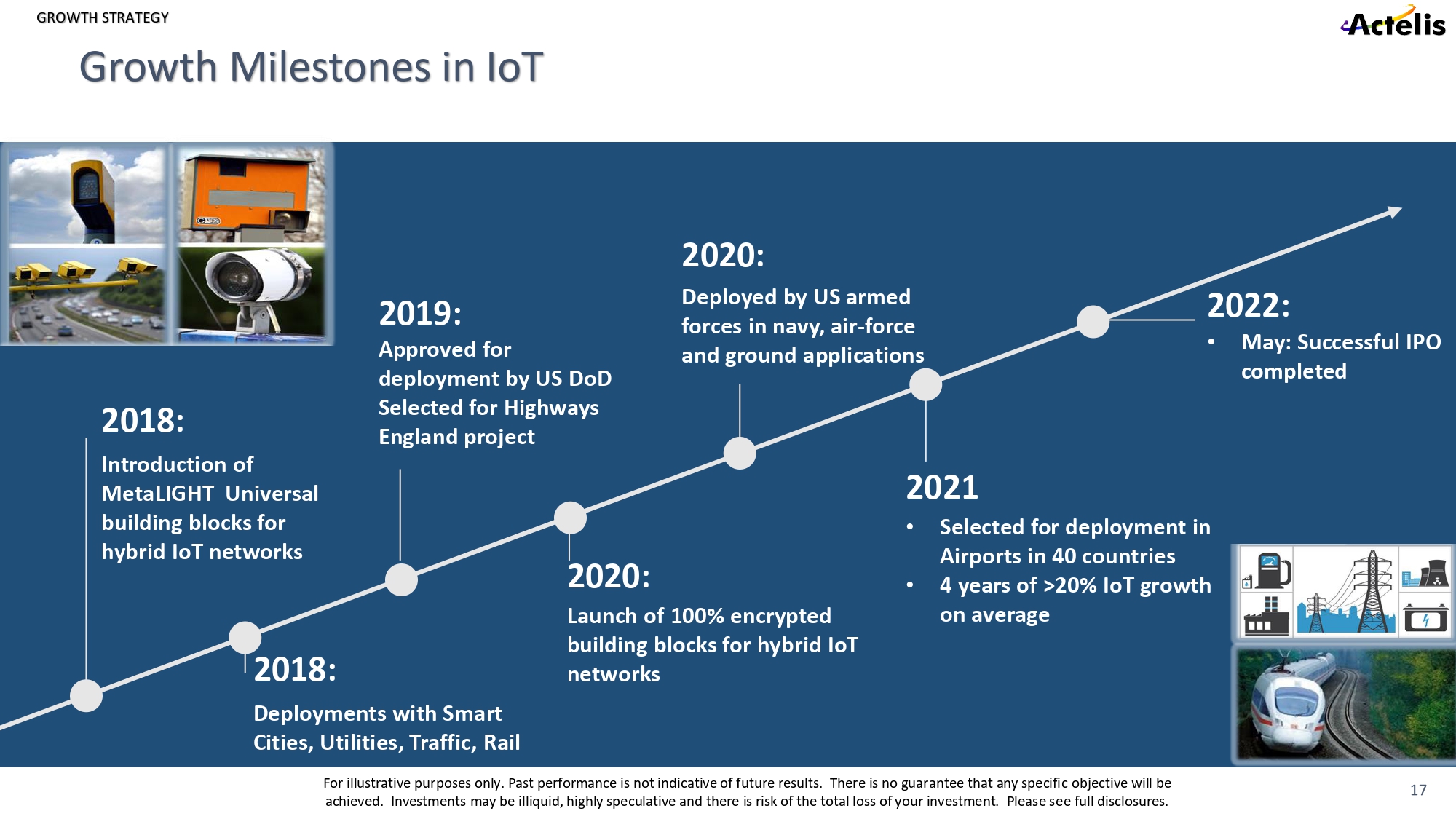 COMPANY OVERVIEW • 30,000 roadside assets, 4,400 miles of strategic road network • 1/3 of network on existing copper, 2/3 on new Fiber • Fiber and copper must be integrated without compromising service levels, reliability, or security • Both must provide reliable high bandwidth over vast distances • Advanced Quality of Service (QoS) must ensure minimum delay for real - time alerts • Network security and advanced troubleshooting tools are paramount Example: Highways England National Road System Modernizing with Actelis’ Secure Hybrid Technology starting 2019 For illustrative purposes only. Past performance is not indicative of future results. There is no guarantee that any specific objective will be achieved. Investments may be illiquid, highly speculative and there is risk of the total loss of your investment. Please see full disclosures. 16