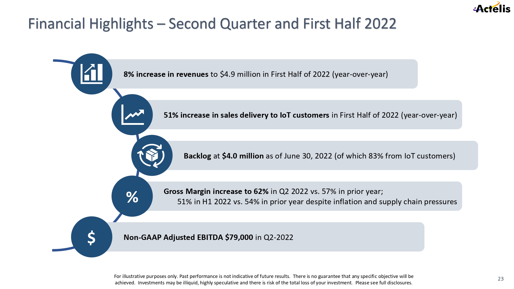Financial Highlights – Second Quarter and First Half 2022 8% increase in revenues to $4.9 million in First Half of 2022 (year - over - year) 51% increase in sales delivery to IoT customers in First Half of 2022 (year - over - year) Non - GAAP Adjusted EBITDA $79,000 in Q2 - 2022 $ Gross Margin increase to 62% in Q2 2022 vs. 57% in prior year; 51% in H1 2022 vs. 54% in prior year despite inflation and supply chain pressures % Backlog at $4.0 million as of June 30, 2022 (of which 83% from IoT customers) For illustrative purposes only. Past performance is not indicative of future results. There is no guarantee that any specific objective will be achieved. Investments may be illiquid, highly speculative and there is risk of the total loss of your investment. Please see full disclosures. 23