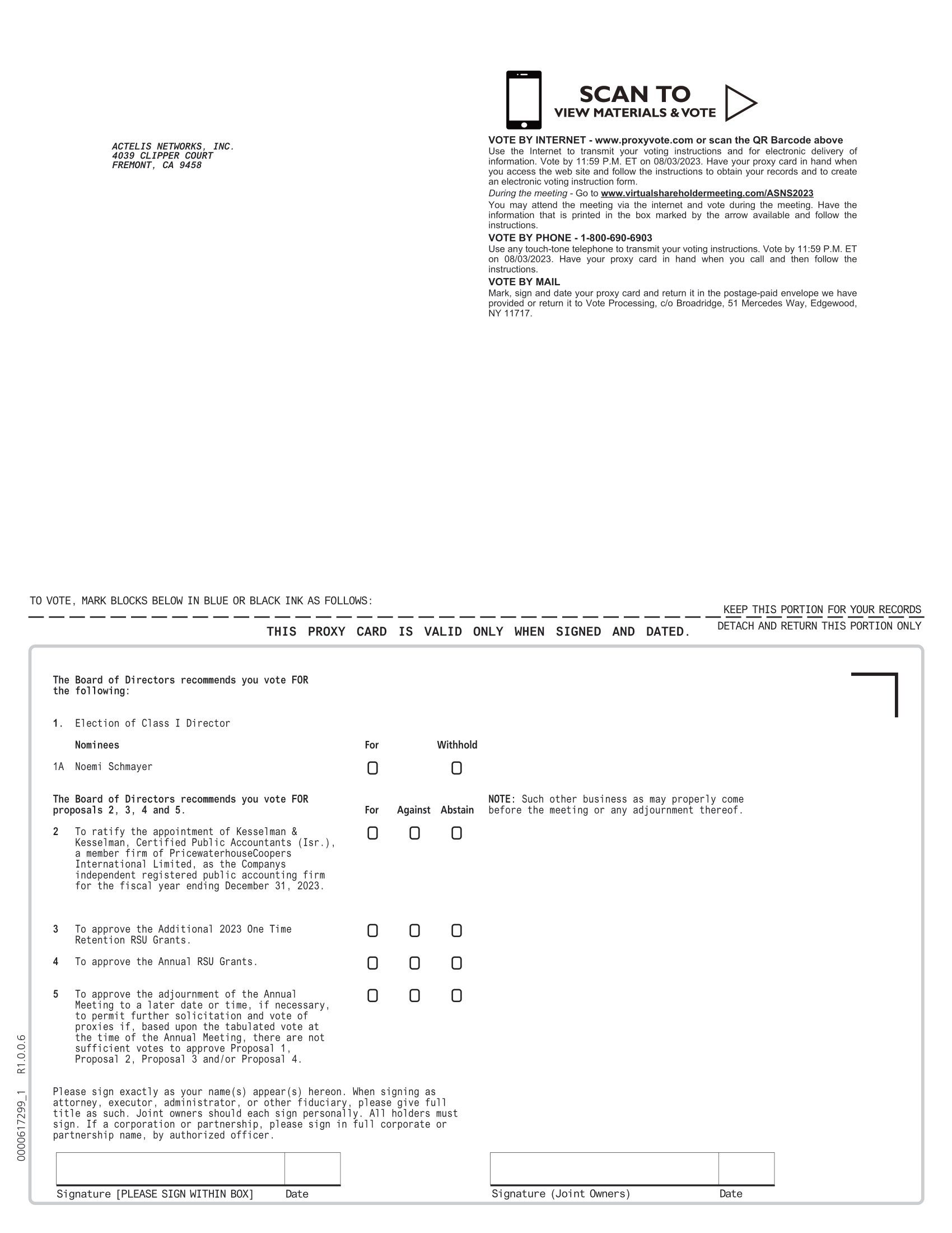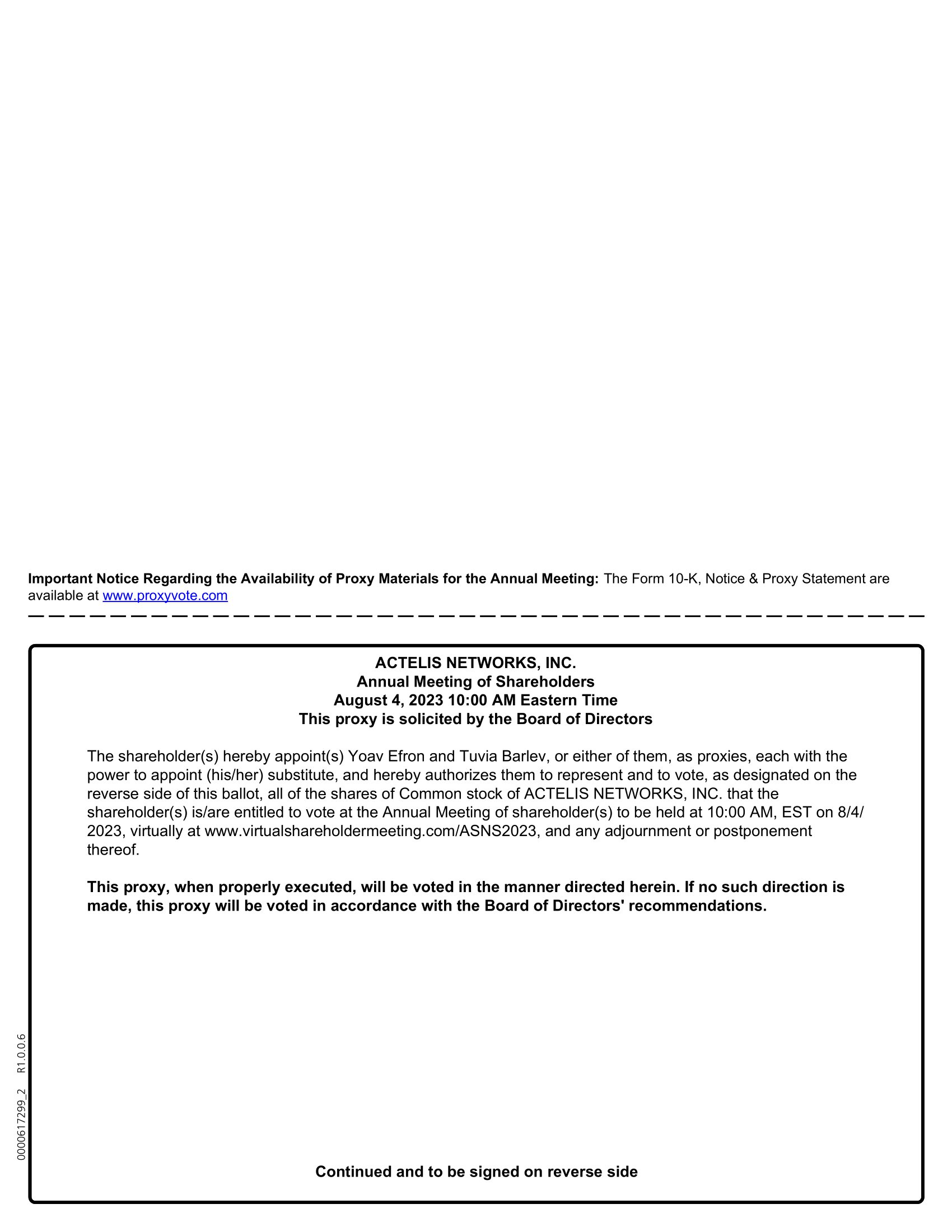 We are pleased to invite you to attend our Annual Meeting of the stockholders (the “Annual Meeting”) of Actelis Networks, Inc., a Delaware corporation (the “Company”), which will be held at virtually at 10:00 a.m. Eastern Standard Time on August 4, 2023, for the following purposes:
