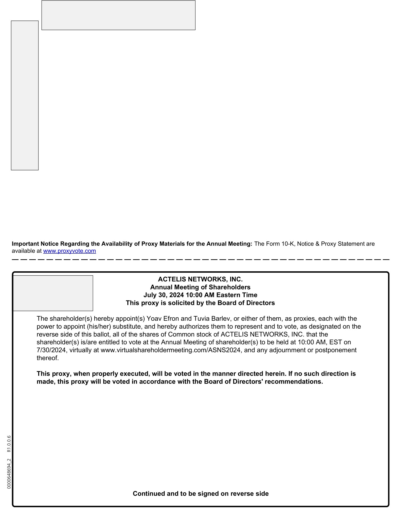An annual meeting of stockholders (the “Annual Meeting”) of Actelis Networks, Inc. (“Actelis”, the “Company”, “we”, “us”, or “our”) will be held virtually on July 30, 2024, at 10:00 a.m. (Eastern Standard Time), virtually at the following link: www.virtualshareholdermeeting.com/ASNS2024, to consider the following proposals: