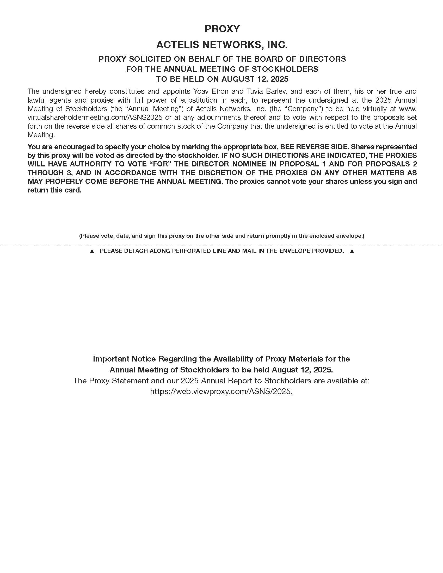 An annual meeting of stockholders (the “Annual Meeting”) of Actelis Networks, Inc. (“Actelis”, the “Company”, “we”, “us”, or “our”) will be held virtually on August 12, 2025, at 10:00 a.m. (Eastern Standard Time), virtually at the following link: www.virtualshareholdermeeting.com/ASNS2025, to consider the following proposals: