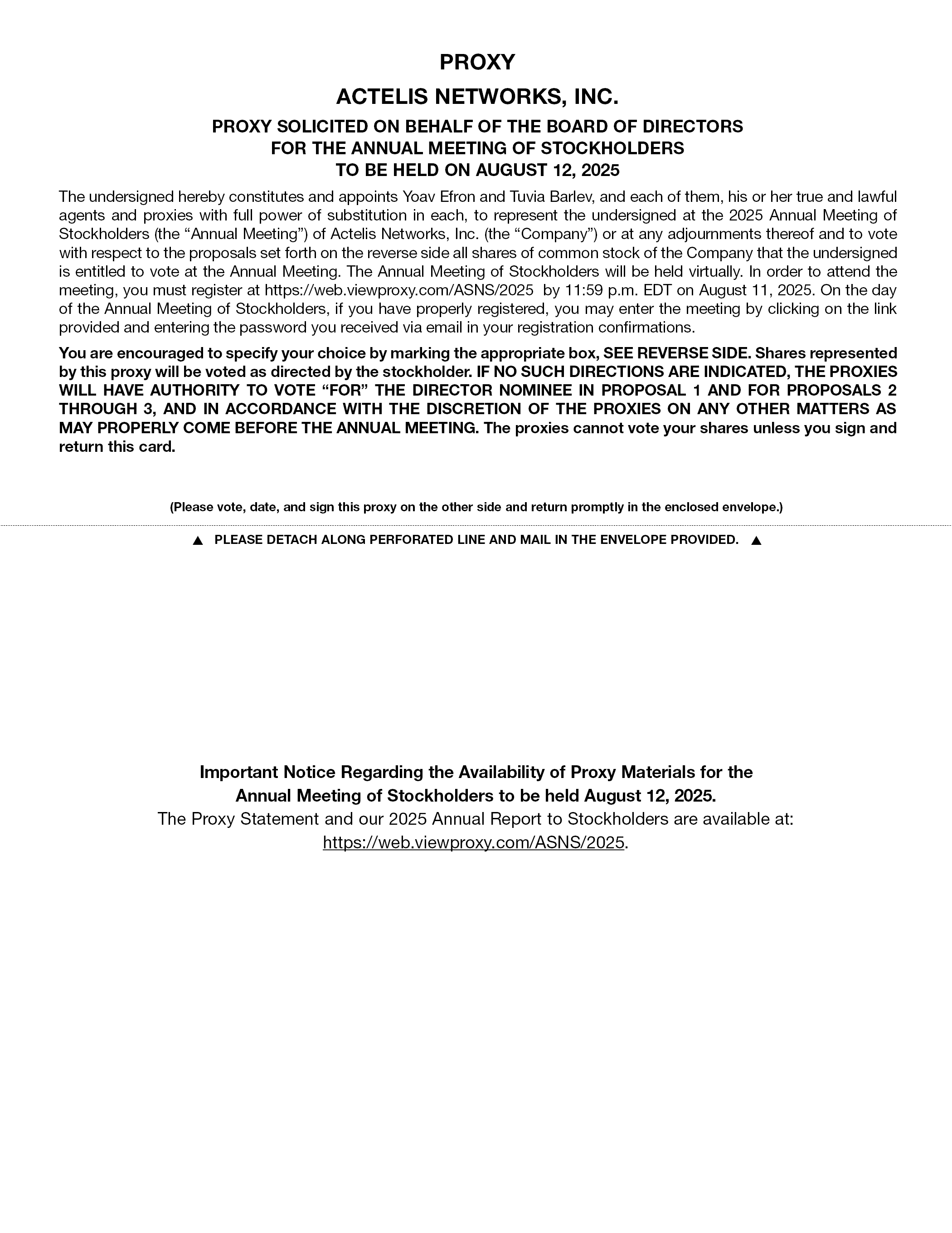 PROXY ACTELIS NETWORKS, INC. PROXY SOLICITED ON BEHALF OF THE BOARD OF DIRECTORS FOR THE ANNUAL MEETING OF STOCKHOLDERS TO BE HELD ON AUGUST 12, 2025 The undersigned hereby constitutes and appoints Yoav Efron and Tuvia Barlev, and each of them, his or her true and lawful agents and proxies with full power of substitution in each, to represent the undersigned at the 2025 Annual Meeting of Stockholders (the “Annual Meeting”) of Actelis Networks, Inc. (the “Company”) or at any adjournments thereof and to vote with respect to the proposals set forth on the reverse side all shares of common stock of the Company that the undersigned is entitled to vote at the Annual Meeting. The Annual Meeting of Stockholders will be held virtually. In order to attend the meeting, you must register at https://web.viewproxy.com/ASNS/2025 by 11:59 p.m. EDT on August 11, 2025. On the day of the Annual Meeting of Stockholders, if you have properly registered, you may enter the meeting by clicking on the link provided and entering the password you received via email in your registration confirmations. You are encouraged to specify your choice by marking the appropriate box, SEE REVERSE SIDE. Shares represented by this proxy will be voted as directed by the stockholder. IF NO SUCH DIRECTIONS ARE INDICATED, THE PROXIES WILL HAVE AUTHORITY TO VOTE “FOR” THE DIRECTOR NOMINEE IN PROPOSAL 1 AND FOR PROPOSALS 2 THROUGH 3, AND IN ACCORDANCE WITH THE DISCRETION OF THE PROXIES ON ANY OTHER MATTERS AS MAY PROPERLY COME BEFORE THE ANNUAL MEETING. The proxies cannot vote your shares unless you sign and return this card. (Please vote, date, and sign this proxy on the other side and return promptly in the enclosed envelope.) PLEASE DETACH ALONG PERFORATED LINE AND MAIL IN THE ENVELOPE PROVIDED. Important Notice Regarding the Availability of Proxy Materials for theAnnual Meeting of Stockholders to be held August 12, 2025. The Proxy Statement and our 2025 Annual Report to Stockholders are available at:https://web.viewproxy.com/ASNS/2025.