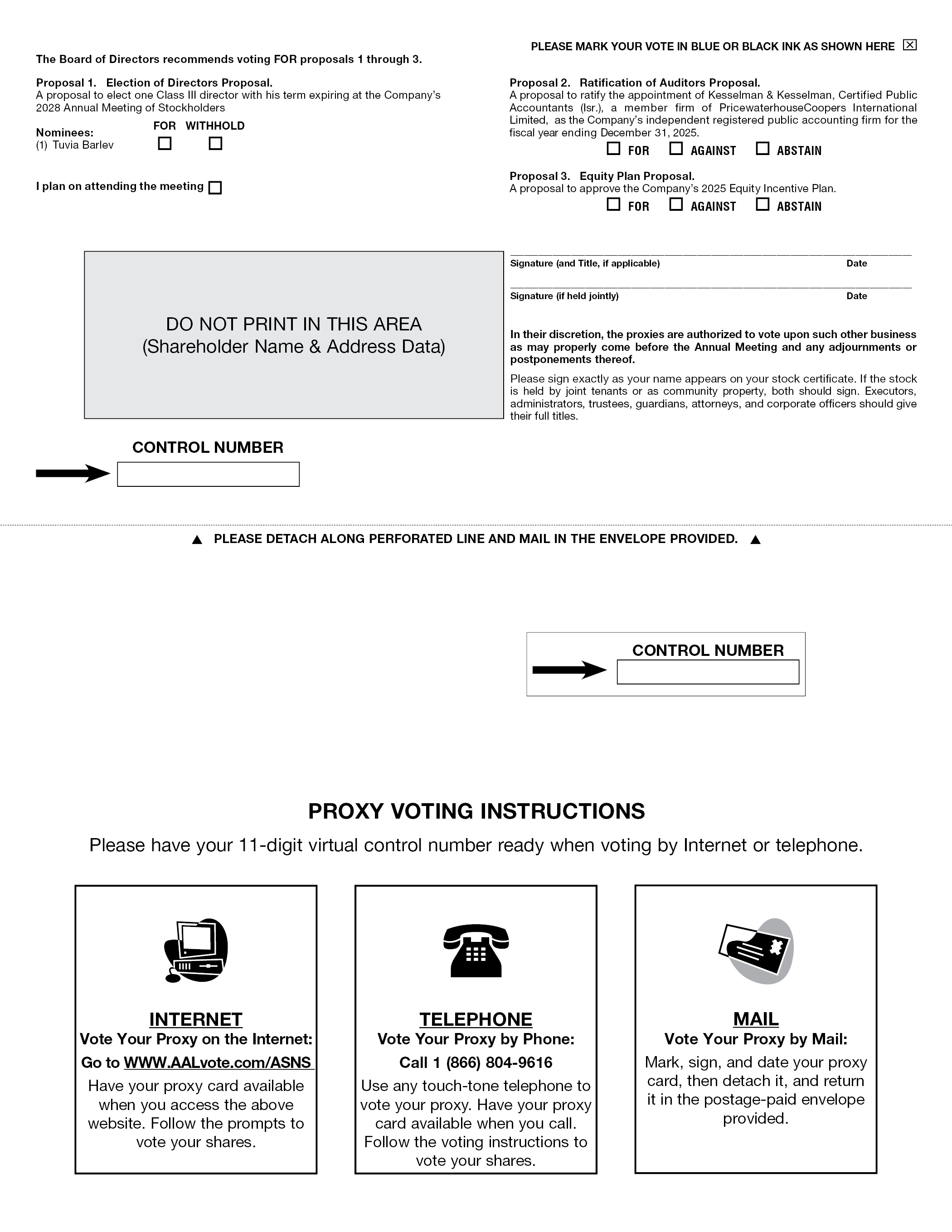 PLEASE MARK YOUR VOTE IN BLUE OR BLACK INK AS SHOWN HERE The Board of Directors recommends voting FOR proposals 1 through 3. Proposal 1. Election of Directors Proposal. A proposal to elect one Class III director with his term expiring at the Company’s 2028 Annual Meeting of Stockholders FOR WITHHOLD Nominees: (1) Tuvia Barlev I plan on attending the meeting Proposal 2. Ratification of Auditors Proposal. A proposal to ratify the appointment of Kesselman & Kesselman, Certified Public Accountants (Isr.), a member firm of PricewaterhouseCoopers International Limited, as the Company’s independent registered public accounting firm for the fiscal year ending December 31, 2025. FOR AGAINST ABSTAIN Proposal 3. Equity Plan Proposal. A proposal to approve the Company’s 2025 Equity Incentive Plan. Signature (and Title, if applicable) Date Signature (if held jointly Date n their discretion, the proxies are authorized to vote upon such other business as may properly come before the Annual Meeting and any adjournments or postponements thereof. Please sign exactly as your name appears on your stock certificate. If the stock is held by joint tenants or as community property, both should sign. Executors, administrators, trustees, guardians, attorneys, and corporate officers should give their full titles. CONTROL NUMBER PLEASE DETACH ALONG PERFORATED LINE AND MAIL IN THE ENVELOPE PROVIDED. CONTROL NUMBER PROXY VOTING INSTRUCTIONS Please have your 11-digit virtual control number ready when voting by Internet or telephone. INTERNET Vote Your Proxy on the Internet: Go to WWW.AALvote.com/ASNS Have your proxy card available when you access the above website. Follow the prompts to vote your shares. TELEPHONE Vote Your Proxy by Phone: Call 1 (866) 804-9616 Use any touch-tone telephone to vote your proxy. Have your proxy card available when you call. Follow the voting instructions to vote your shares. MAIL Vote Your Proxy by Mail: Mark, sign, and date your proxy card, then detach it, and return it in the postage-paid envelope provided.