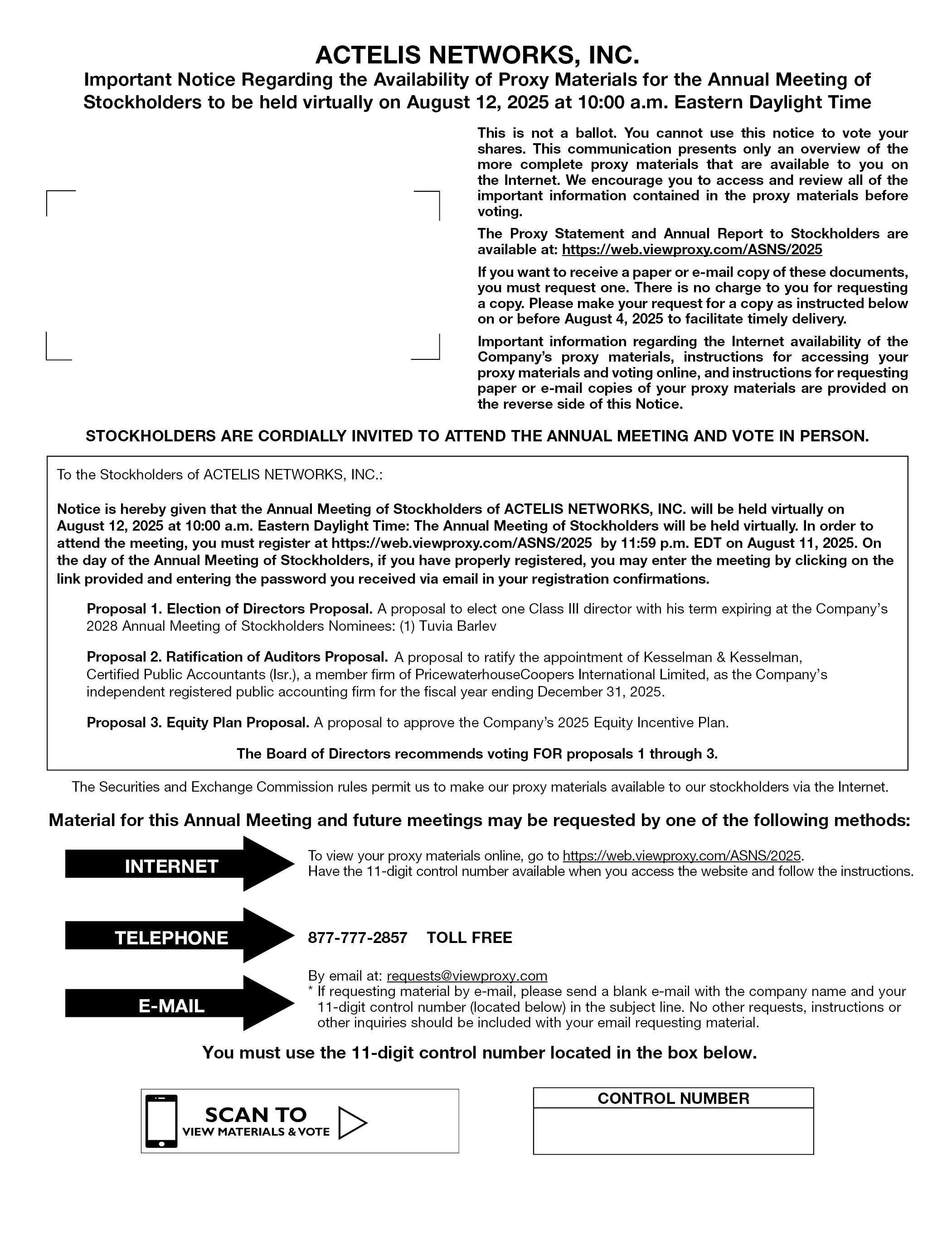 ACTELIS NETWORKS, INC. Important Notice Regarding the Availability of Proxy Materials for the Annual Meeting of Stockholders to be held virtually on August 12, 2025 at 10:00 a.m. Eastern Daylight Time This is not a ballot. You cannot use this notice to vote your shares. This communication presents only an overview of the more complete proxy materials that are available to you on the Internet. We encourage you to access and review all of the important information contained in the proxy materials before voting. The Proxy Statement and Annual Report to Stockholders are available at: https://web.viewproxy.com/ASNS/2025 If you want to receive a paper or e-mail copy of these documents, you must request one. There is no charge to you for requesting a copy. Please make your request for a copy as instructed below on or before August 4, 2025 to facilitate timely delivery. Important information regarding the Internet availability of the Company’s proxy materials, instructions for accessing your proxy materials and voting online, and instructions for requesting paper or e-mail copies of your proxy materials are provided on the reverse side of this Notice. STOCKHOLDERS ARE CORDIALLY INVITED TO ATTEND THE ANNUAL MEETING AND VOTE IN PERSON. the Stockholders of ACTELIS NETWORKS, INC.: Notice is hereby given that the Annual Meeting of Stockholders of ACTELIS NETWORKS, INC. will be held virtually on August 12, 2025 at 10:00 a.m. Eastern Daylight Time: The Annual Meeting of Stockholders will be held virtually. In order to attend the meeting, you must register at https://web.viewproxy.com/ASNS/2025 by 11:59 p.m. EDT on August 11, 2025. On the day of the Annual Meeting of Stockholders, if you have properly registered, you may enter the meeting by clicking on the link provided and entering the password you received via email in your registration confirmations. Proposal 1. Election of Directors Proposal. A proposal to elect one Class III director with his term expiring at the Company’s 2028 Annual Meeting of Stockholders Nominees: (1) Tuvia Barlev Proposal 2. Ratification of Auditors Proposal. A proposal to ratify the appointment of Kesselman & Kesselman, Certified Public Accountants (Isr.), a member firm of PricewaterhouseCoopers International Limited, as the Company’s independent registered public accounting firm for the fiscal year ending December 31, 2025. Proposal 3. Equity Plan Proposal. A proposal to approve the Company’s 2025 Equity Incentive Plan. The Board of Directors recommends voting FOR proposals 1 through 3. The Securities and Exchange Commission rules permit us to make our proxy materials available to our stockholders via the Internet. Material for this Annual Meeting and future meetings may be requested by one of the following methods: To view your proxy materials online, go to https://web.viewproxy.com/ASNS/2025. Have the 11-digit control number available when you access the website and follow the instructions. 877-777-2857 TOLL FREE By email at: requests@viewproxy.com * If requesting material by e-mail, please send a blank e-mail with the company name and your 11-digit control number (located below) in the subject line. No other requests, instructions or other inquiries should be included with your email requesting material. You must use the 11-digit control number located in the box below. INTERNET TELEPHONE E-MAIL CONTROL NUMBER SCAN TO VIEW MATERIALS & VOTE w