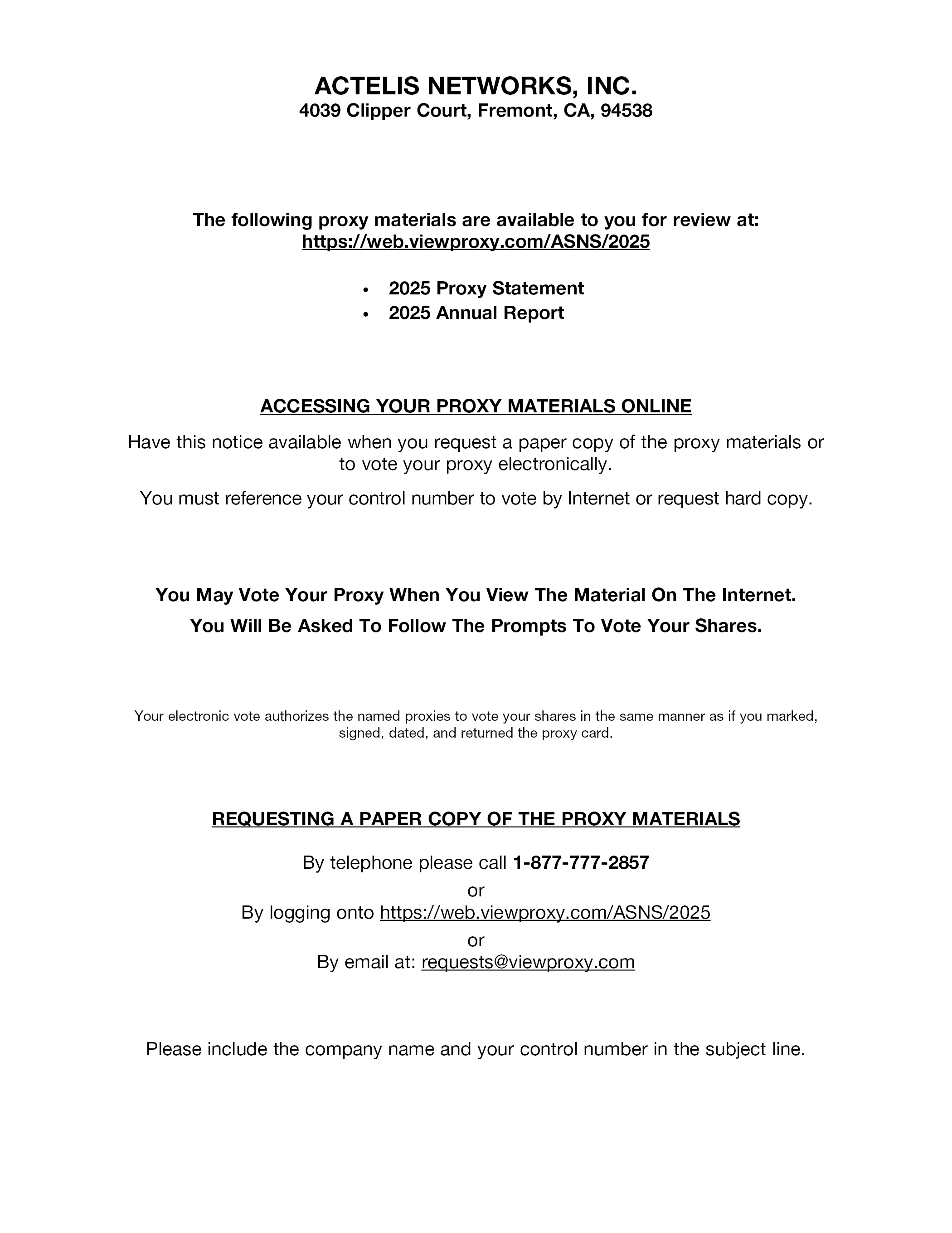 ACTELIS NETWORKS, INC. 4039 Clipper Court, Fremont, CA, 94538 The following proxy materials are available to you for review at: https://web.viewproxy.com/ASNS/2025 • 2025 Proxy Statement • 2025 Annual Report ACCESSING YOUR PROXY MATERIALS ONLINE Have this notice available when you request a paper copy of the proxy materials or to vote your proxy electronically. You must reference your control number to vote by Internet or request hard copy. You May Vote Your Proxy When You View The Material On The Internet. You Will Be Asked To Follow The Prompts To Vote Your Shares. Your electronic vote authorizes the named proxies to vote your shares in the same manner as if you marked, signed, dated, and returned the proxy card. REQUESTING A PAPER COPY OF THE PROXY MATERIALS By telephone please call 1-877-777-2857 or By logging onto https://web.viewproxy.com/ASNS/2025 or By email at: requests@viewproxy.com Please include the company name and your control number in the subject line.