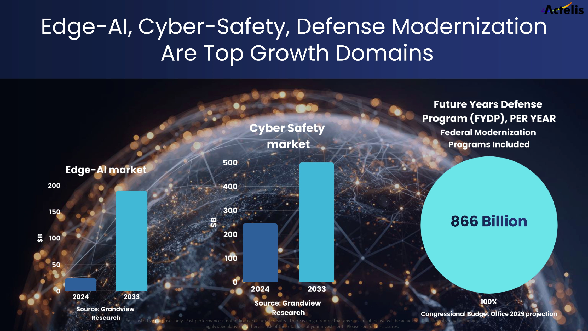 For illustrative purposes only. Past performance is not indicative of future results. There is no guarantee that any specifi c o bjective will be achieved. Investments may be illiquid, highly speculative and there is risk of the total loss of your investment. Please see full disclosures. 3 Edge - AI, Cyber - Safety, Defense Modernization Are Top Growth Domains 866 Billion