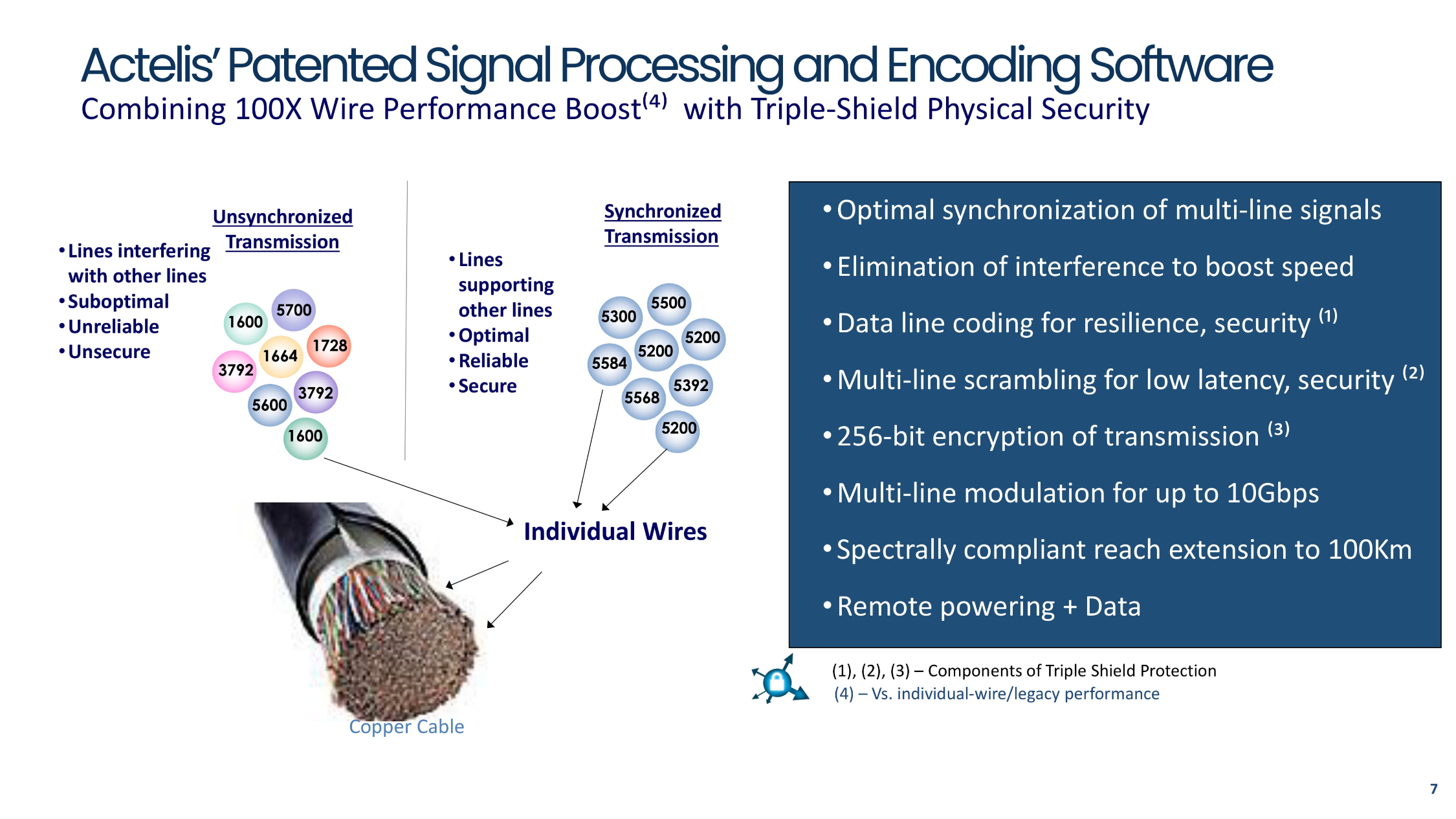Connectivity Modernization To Grow Exponentially • Billions of devices are currently connected with copper cables Historically low speed, low reliability, not secure • New Fiber Optic cables are being installed Reliable, fast, but very expensive and slow to deploy • Wireless is getting better Not fast enough, not secure enough Need to Connect Securely Tens of Millions of Locations 6