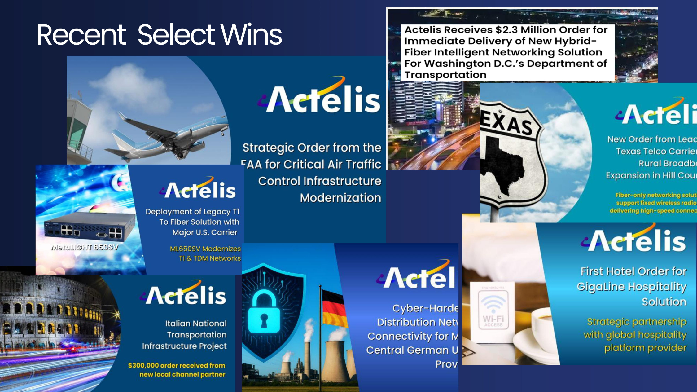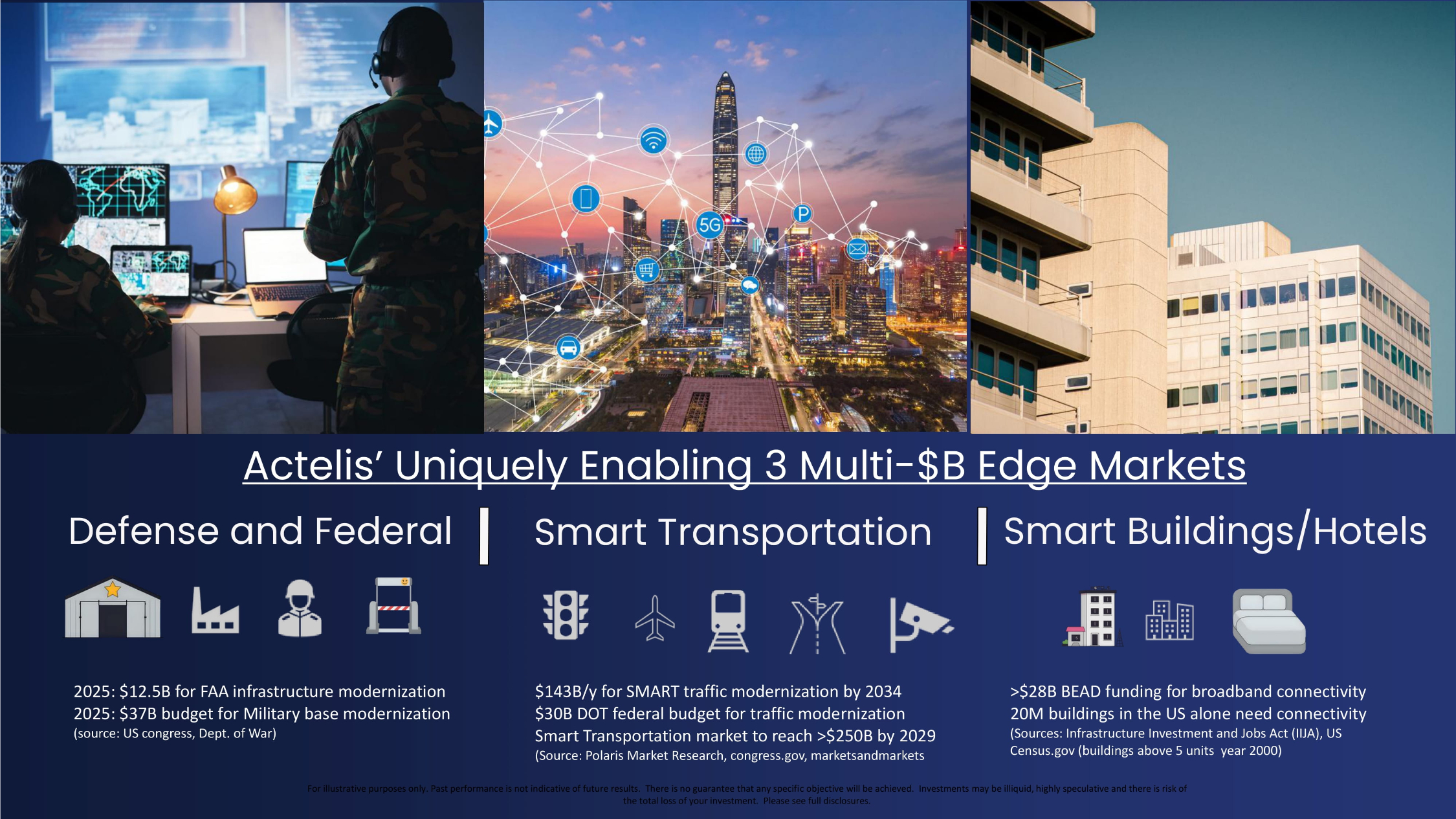 Smart Transportation Smart Buildings/Hotels Defense and Federal Actelis’ Uniquely Enabling 3 Multi - $B Edge Markets For illustrative purposes only. Past performance is not indicative of future results. There is no guarantee that any specifi c o bjective will be achieved. Investments may be illiquid, highly speculative and there is risk of the total loss of your investment. Please see full disclosures. 2025: $12.5B for FAA infrastructure modernization 2025: $37B budget for Military base modernization (source: US congress, Dept. of War) $143B/y for SMART traffic modernization by 2034 $30B DOT federal budget for traffic modernization Smart Transportation market to reach >$250B by 2029 (Source: Polaris Market Research, congress.gov, marketsandmarkets >$28B BEAD funding for broadband connectivity 20M buildings in the US alone need connectivity (Sources: Infrastructure Investment and Jobs Act (IIJA), US Census.gov (buildings above 5 units year 2000)