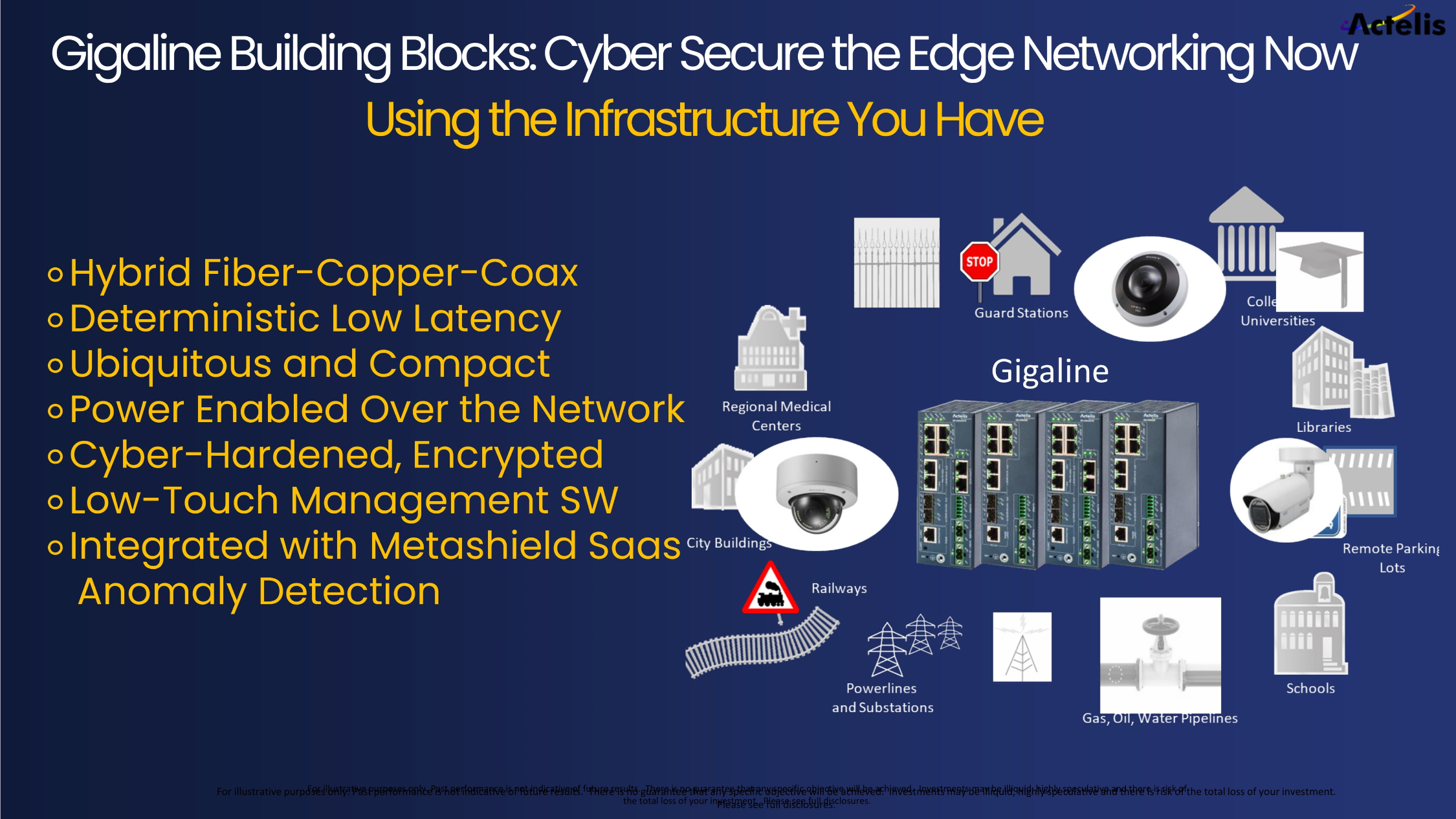 For illustrative purposes only. Past performance is not indicative of future results. There is no guarantee that any specifi c o bjective will be achieved. Investments may be illiquid, highly speculative and there is risk of the total loss of your inves tme nt. Please see full disclosures. Gigaline Building Blocks: Cyber Secure the Edge Networking Now Using the Infrastructure You Have ⚬ Hybrid Fiber - Copper - Coax ⚬ Deterministic Low Latency ⚬ Ubiquitous and Compact ⚬ Power Enabled Over the Network ⚬ Cyber - Hardened, Encrypted ⚬ Low - Touch Management SW ⚬ Integrated with Metashield Saas Anomaly Detection For illustrative purposes only. Past performance is not indicative of future results. There is no guarantee that any specifi c o bjective will be achieved. Investments may be illiquid, highly speculative and there is risk of the total loss of your investment. Please see full disclosures. Gigaline